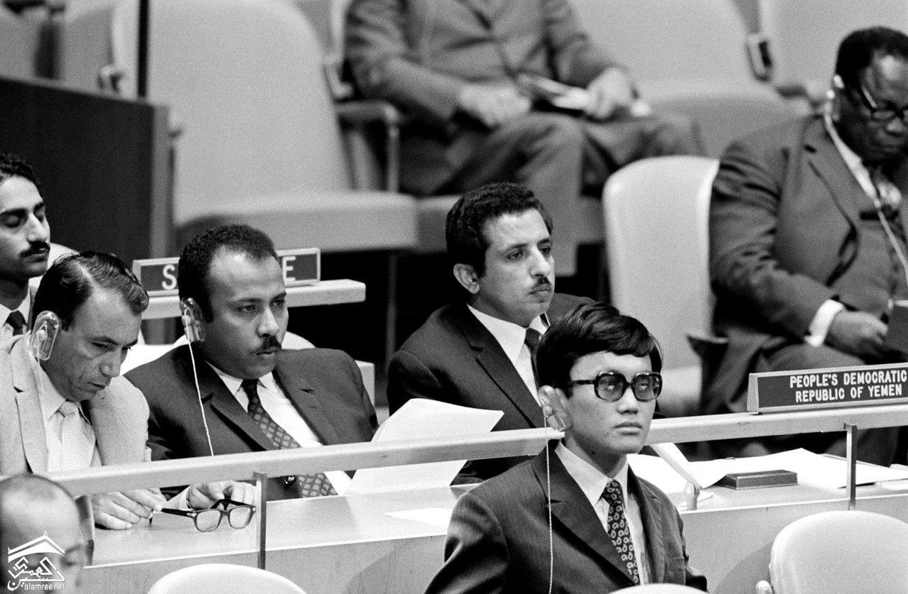 يظهر هنا وفد جمهورية اليمن الديمقراطية الشعبية برئاسة محمد صالح العويقي (يمين) وزير الخارجية. يجلس بجانبه عبد الملك إسماعيل ، المندوب الدائم لدى الأمم المتحدة