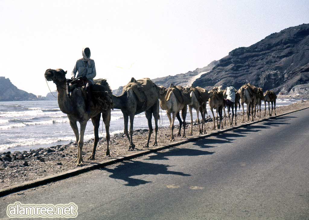 قافله من الجمال في طريقها الى ابين بعد افراغ حمولتها من السمسم لاستخدامه في الطباخه في عدن قبل 60 عاما