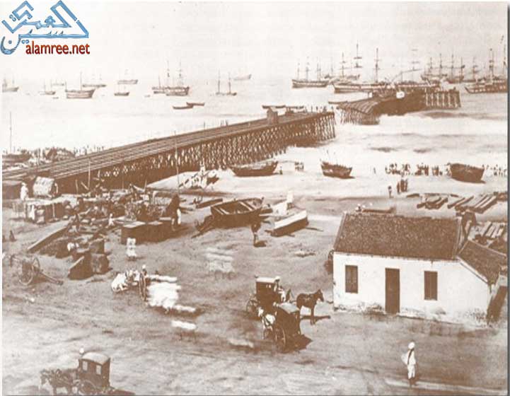 ميناء النواهي أثناء بناء كاسر الأمواج او مد جسر في عمق البحر لرسو سفن قوات الاحتلال في أواخر القرن الثامن عشر