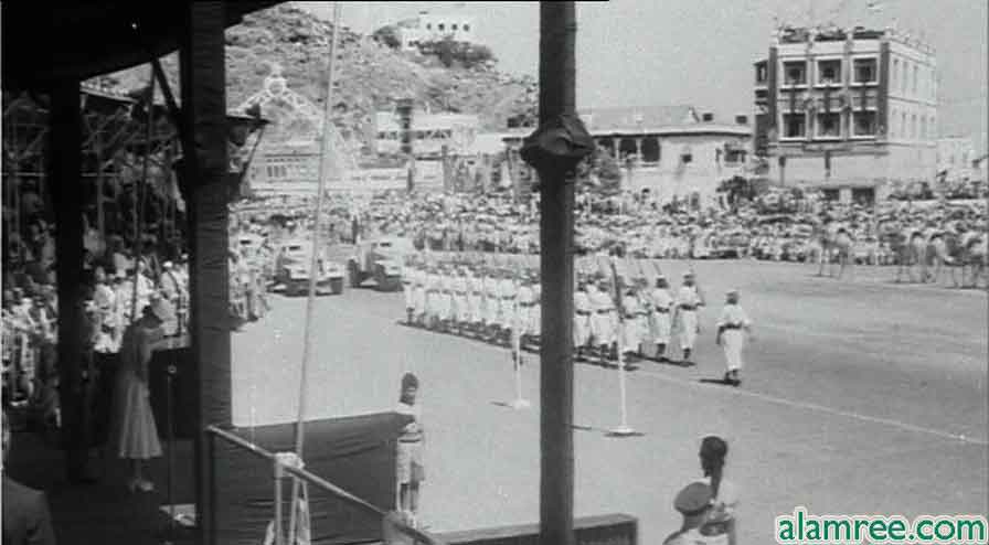 صورة لملكة بريطانيا اثناء اثناء حفل الاستعراض ومرور وحدات رمزية عسكريه من جيش الليوي وجيش البادية الحضرمي