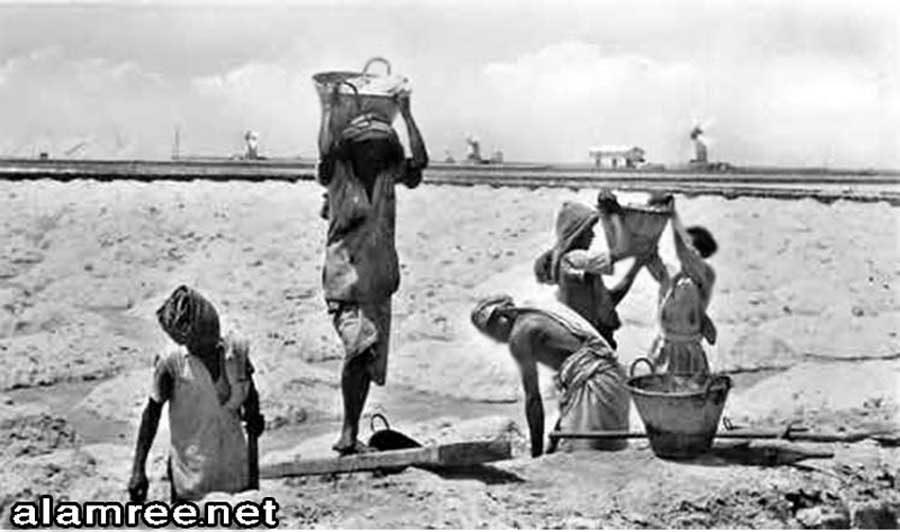صورة لعمال الملح يفرغون احد الحقول من الملح عام 1926