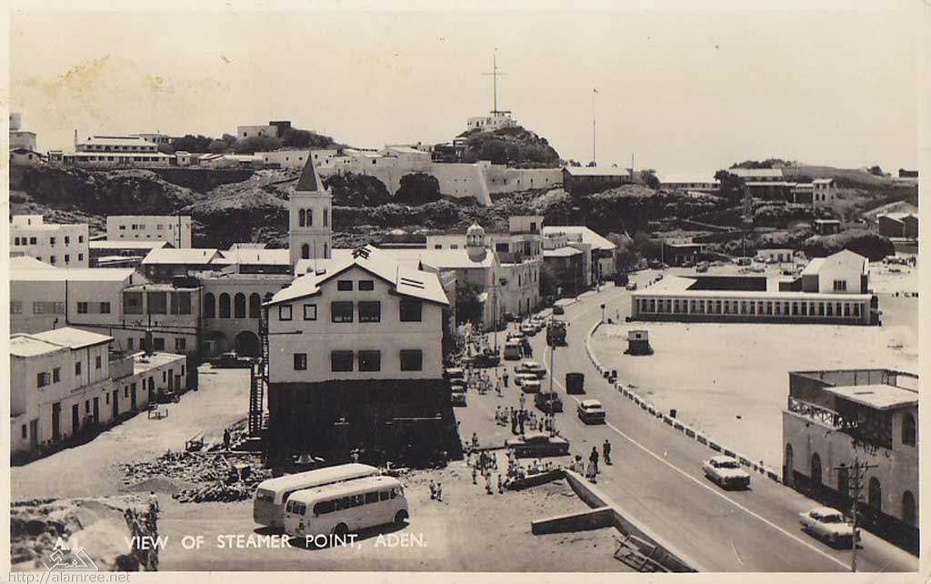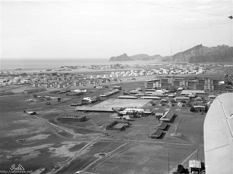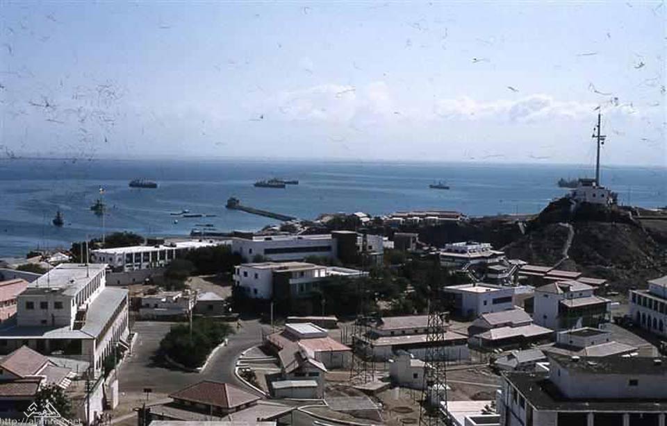 ميناء عدن في الستينات وفي الخلفيه عقبة عدن وبابها |
