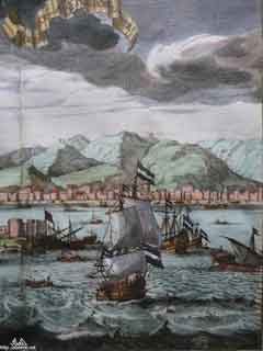 صوره مقربه لجزء من الرسمه لعدن تظهر تفاصيل اكثر عن تحصينات عدن اسفل جبل قلعة صيره
