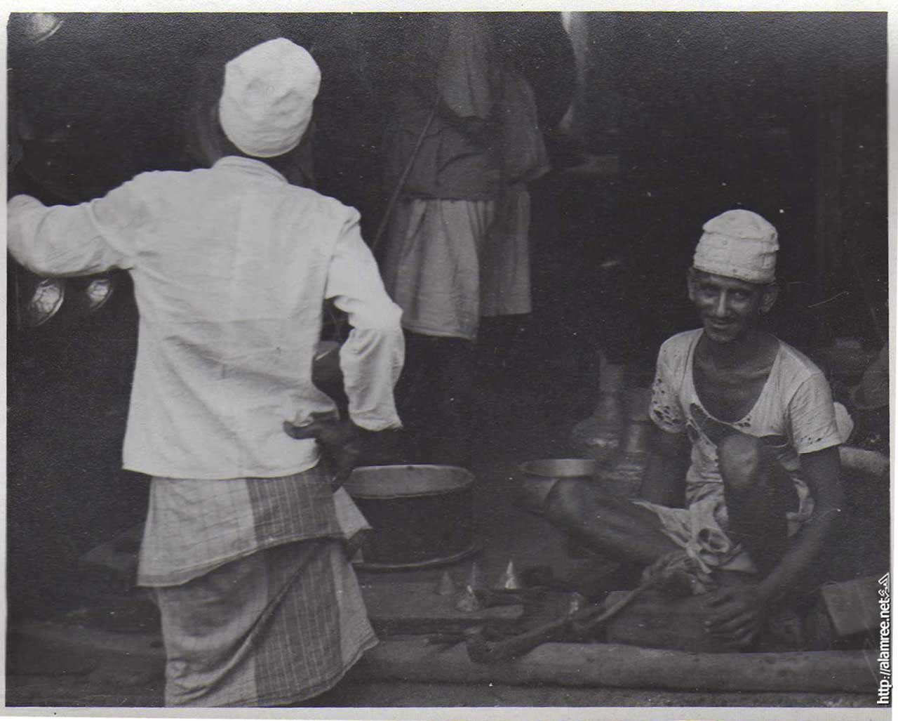 احد المتسولين جالسا على طريق مرور البحاره في التواهي في الاربعينيات