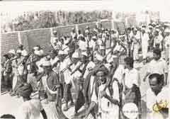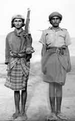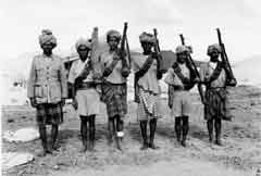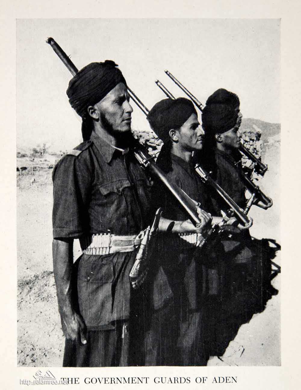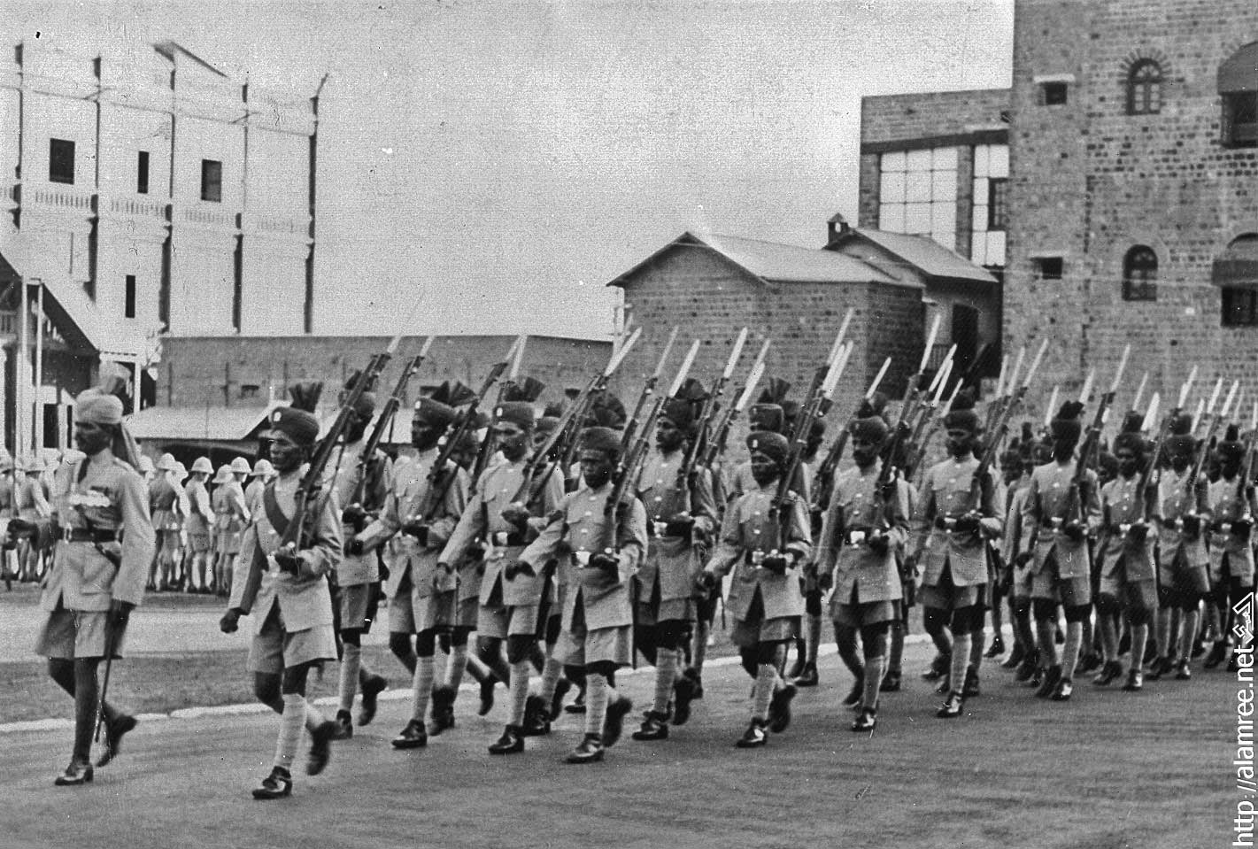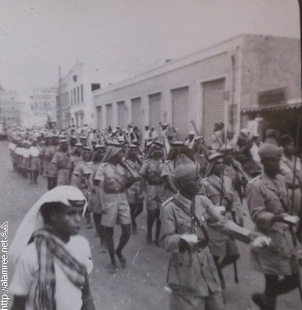 الشرطة المسلحة عدن يسيرون مع الحراب الثابتة.1937 . لاحظ التاثير الهندي ، ممثلة في نمط