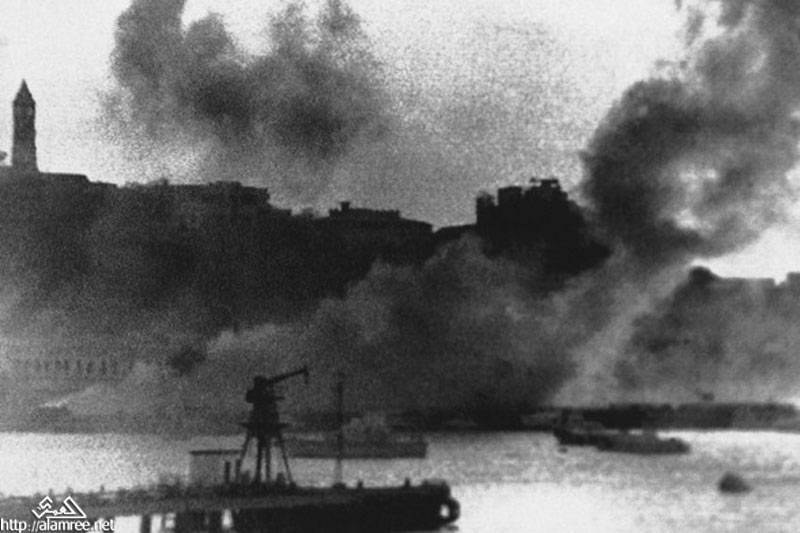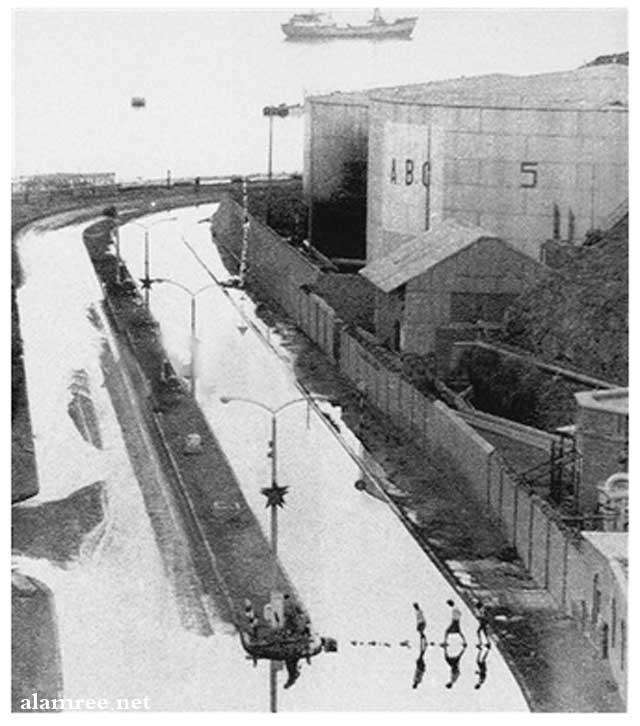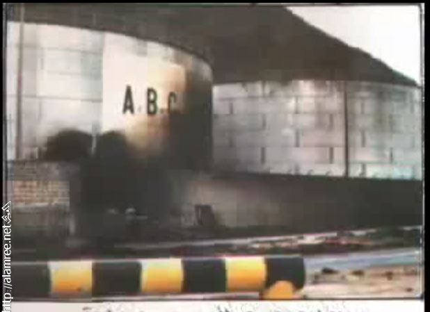 اثار المعارك على خزانات عدن لتموين البواخر بالوقود وفي المنعطف مرت دبابه