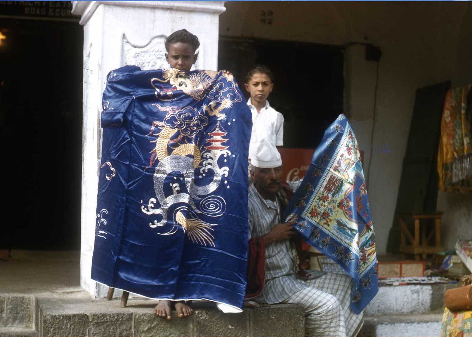 التواهي عدن وباعة متجولين يبيعون اقمشه حريريه عليها رسومات مختلفه بعضها