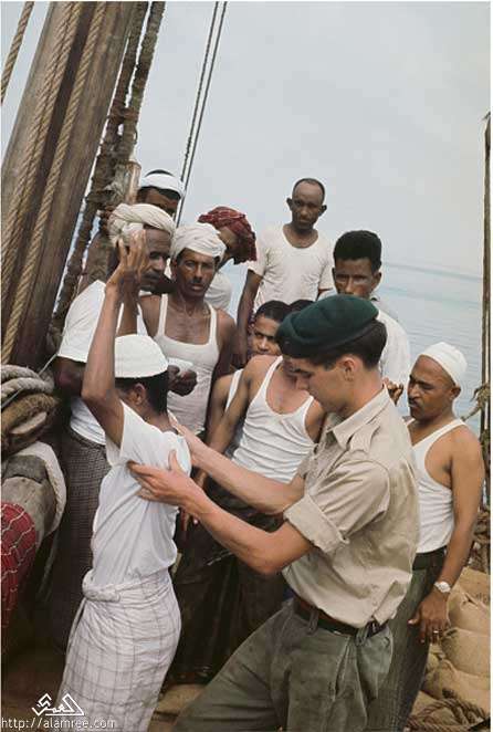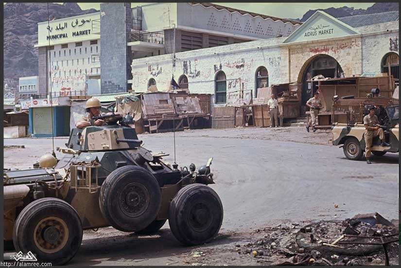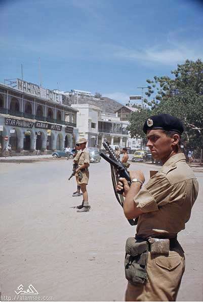 احد جنود الجيش البريطاني عند احد مداخل عدن يقوم بعملية التفتيش بحثا عن