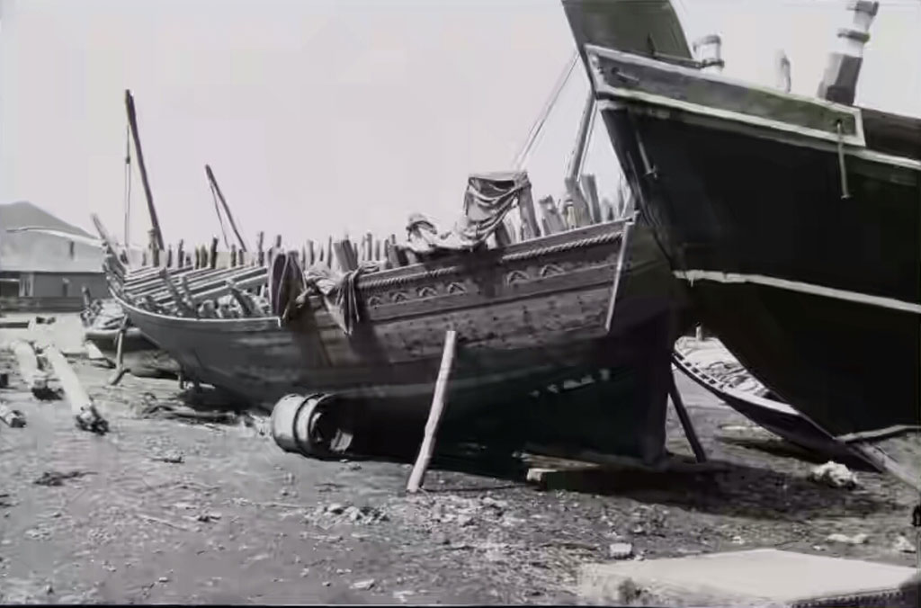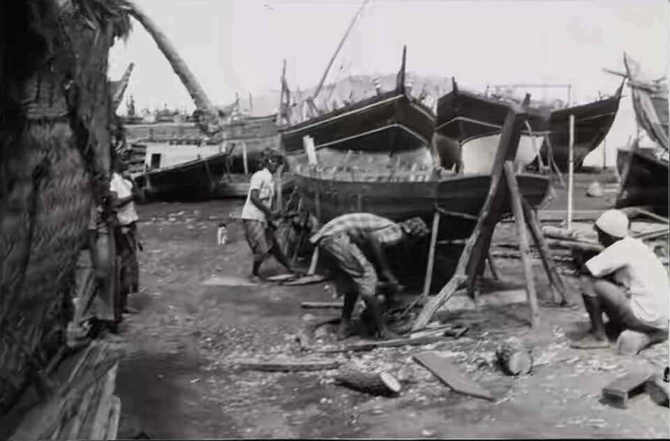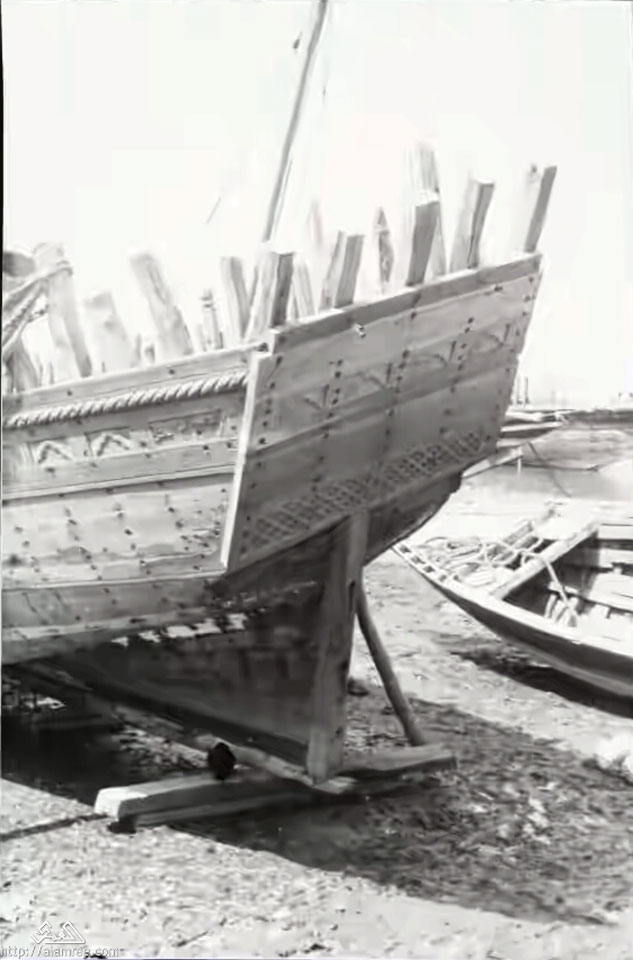 المعلا والعديد من السفن الشراعيه التي تصنع هناك وفي الخلفية جبل حديد