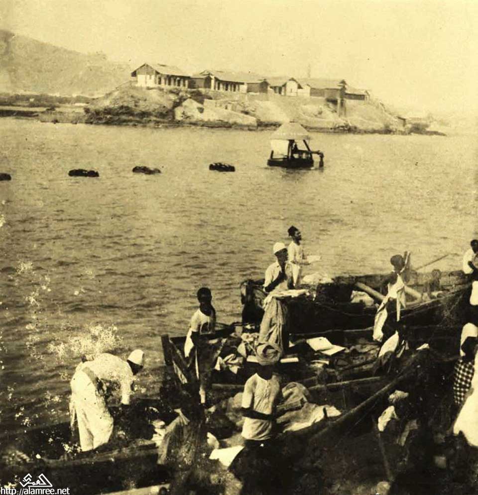 ميناء المعلا مركز صناعة السفن الشراعية وفي الخلفيه جزيرة العبيد