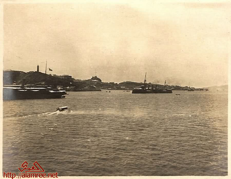 ميناء عدن عام 1942 وفي يمين الصوره جزء من جزيرة الحجرالصحي |