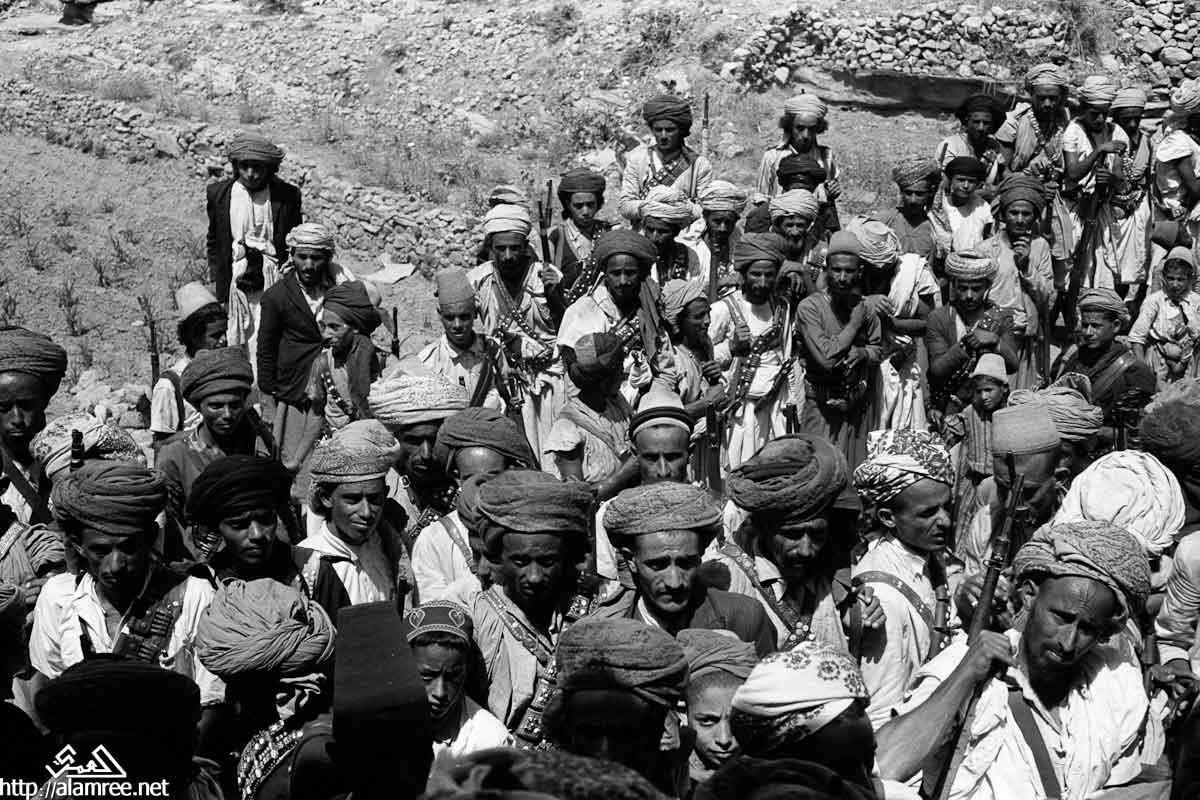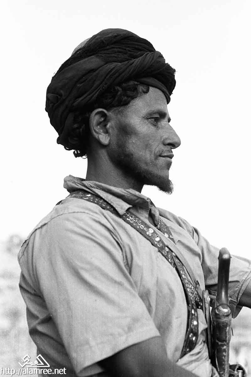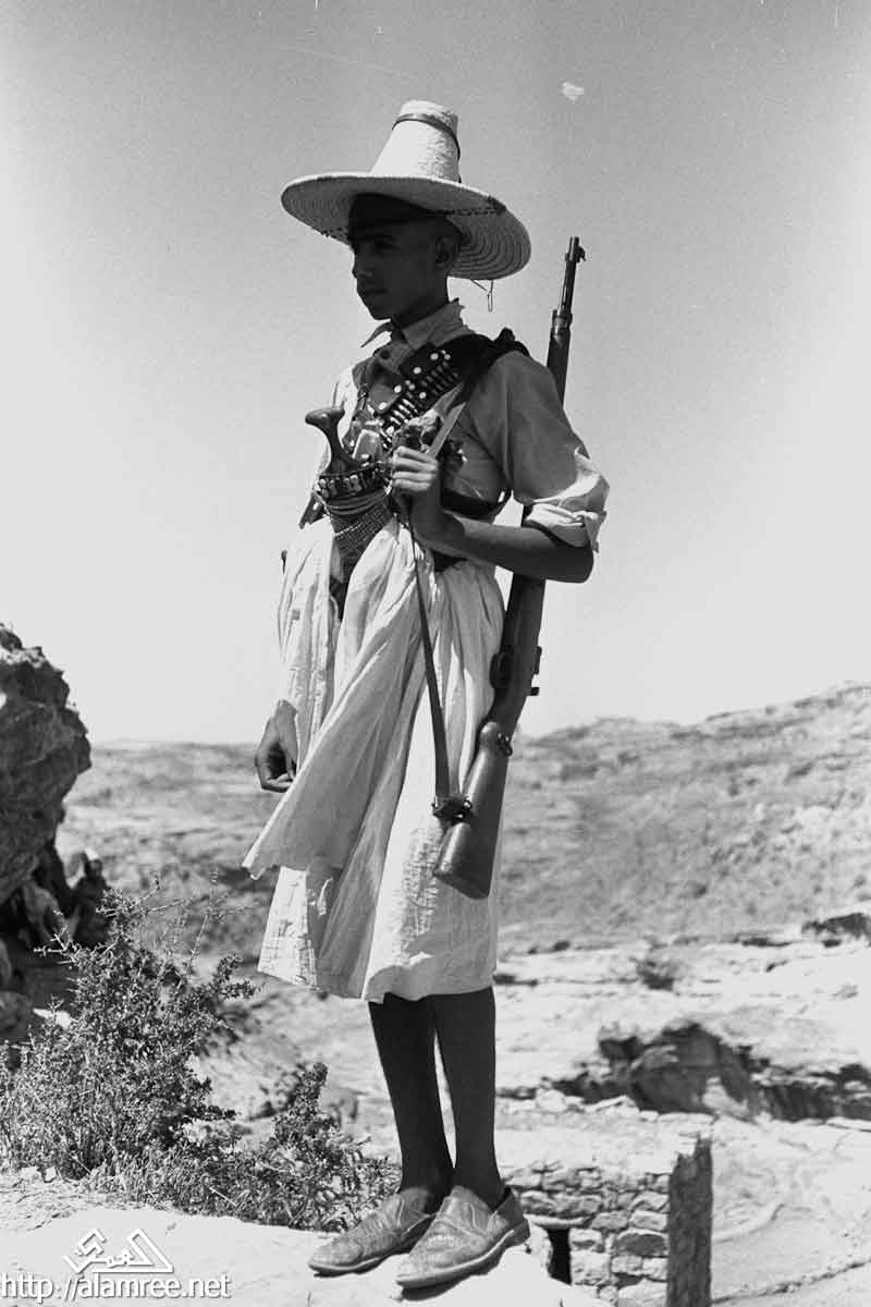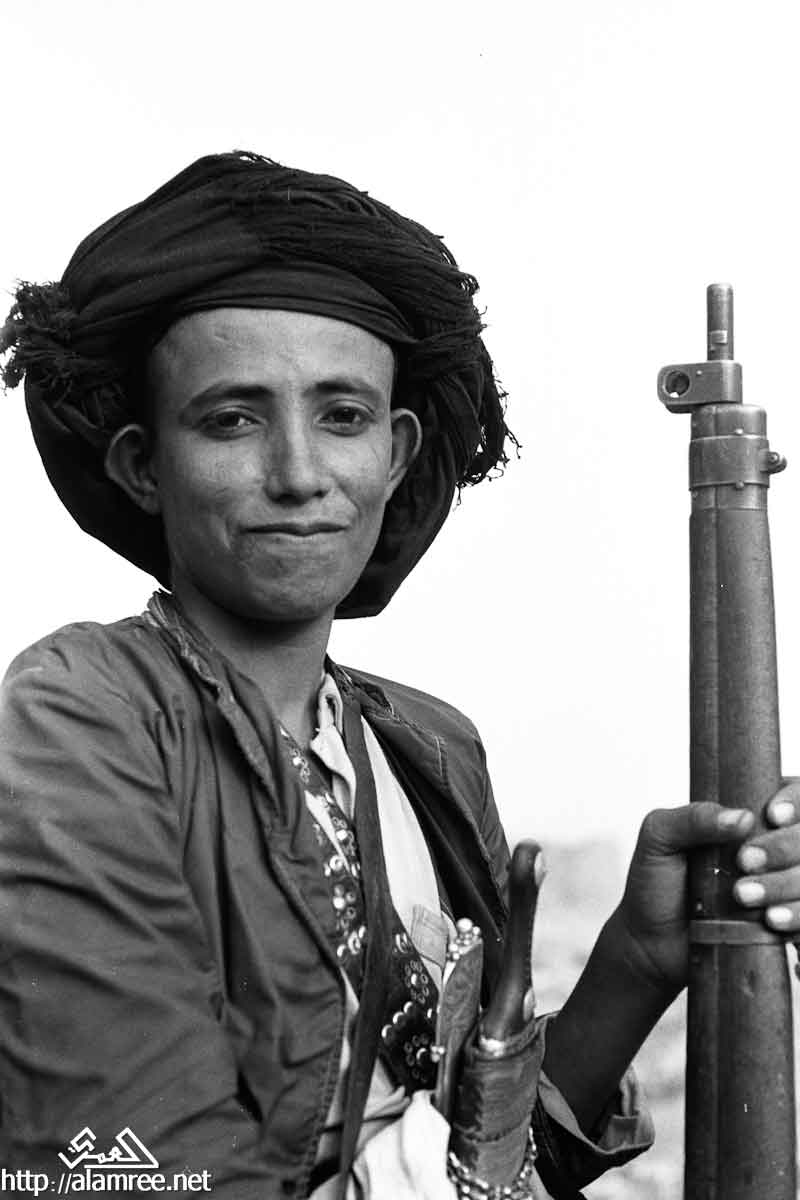 صورة لشاب يحمل بندقية كبيرة ويرتدي قبعة مميزة، الماندولير حول صدره وخنجرا في حزامه