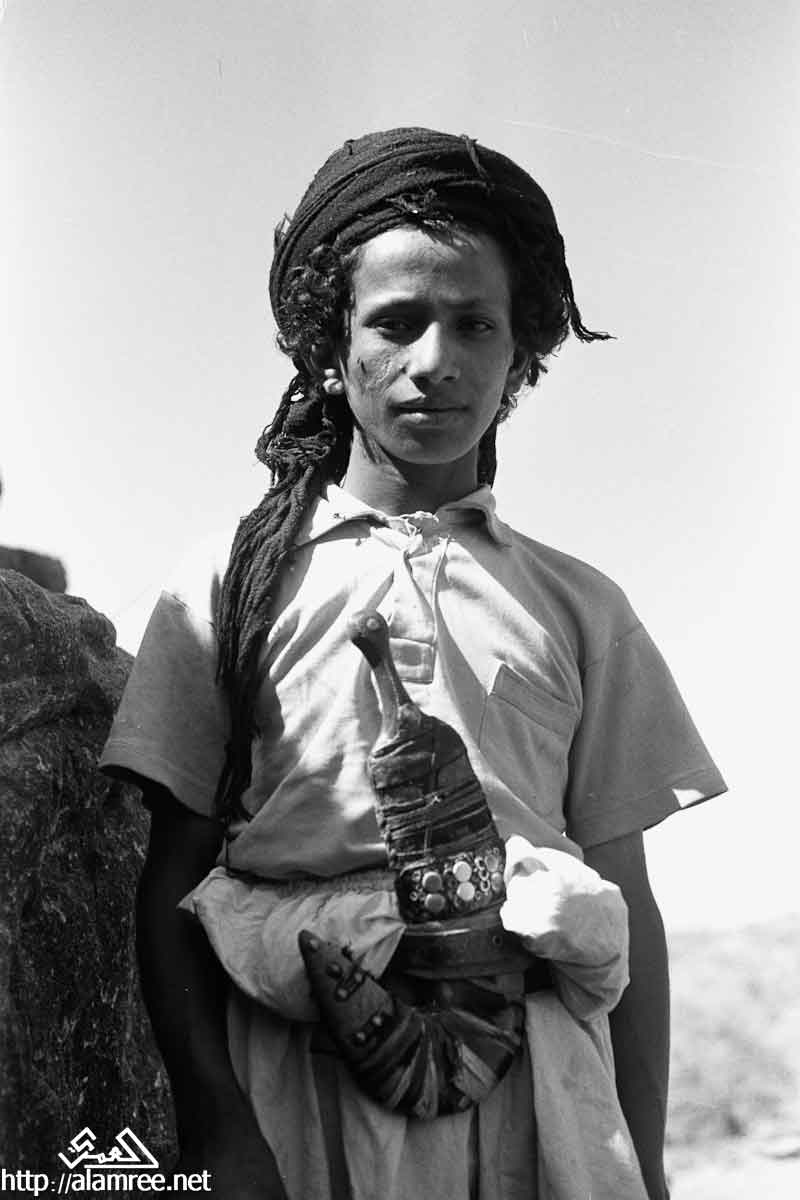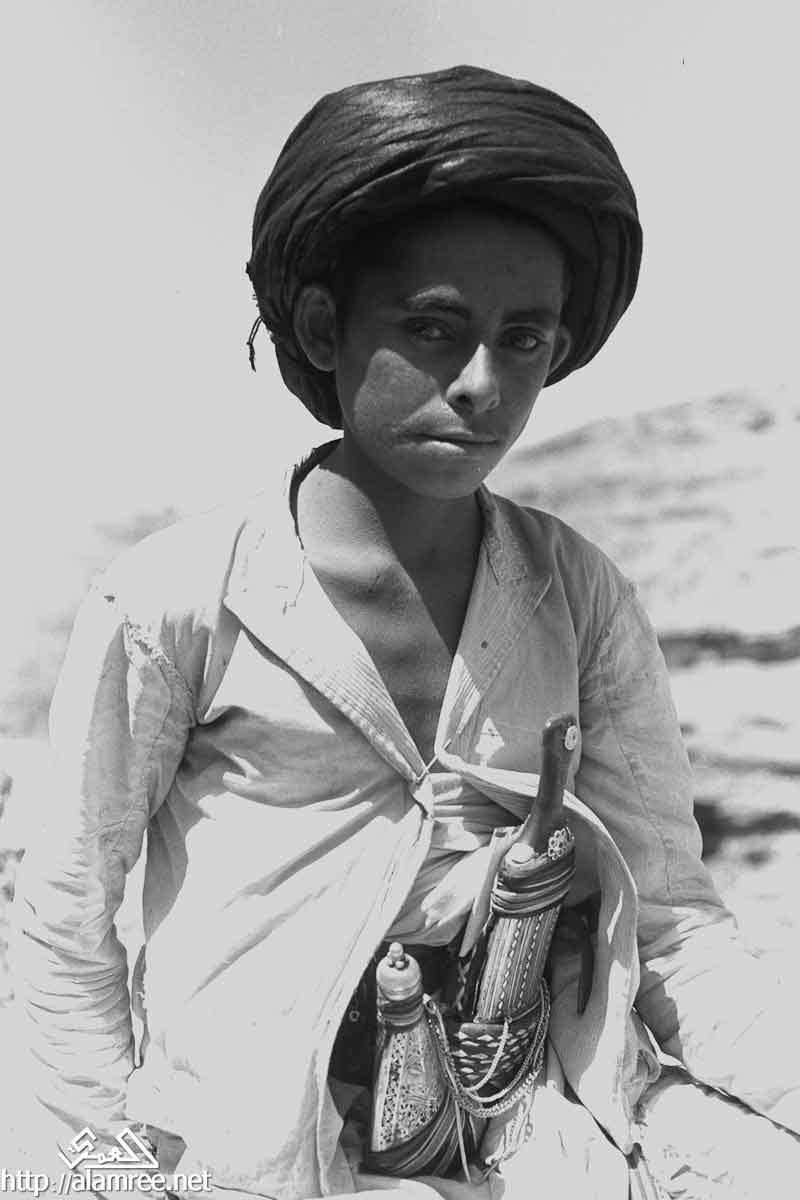 صورة لشاب يرتدي خنجر كبير مغمد في حزامه