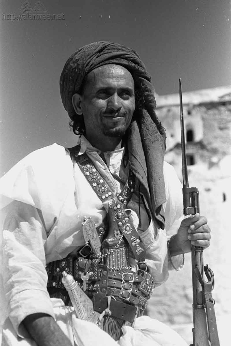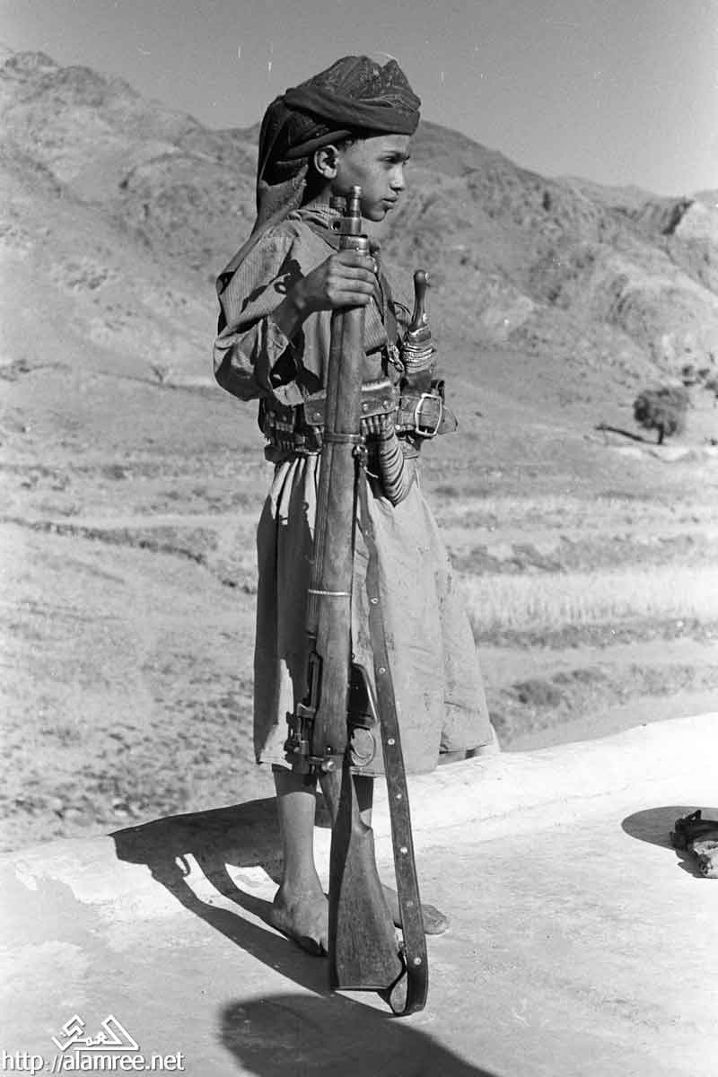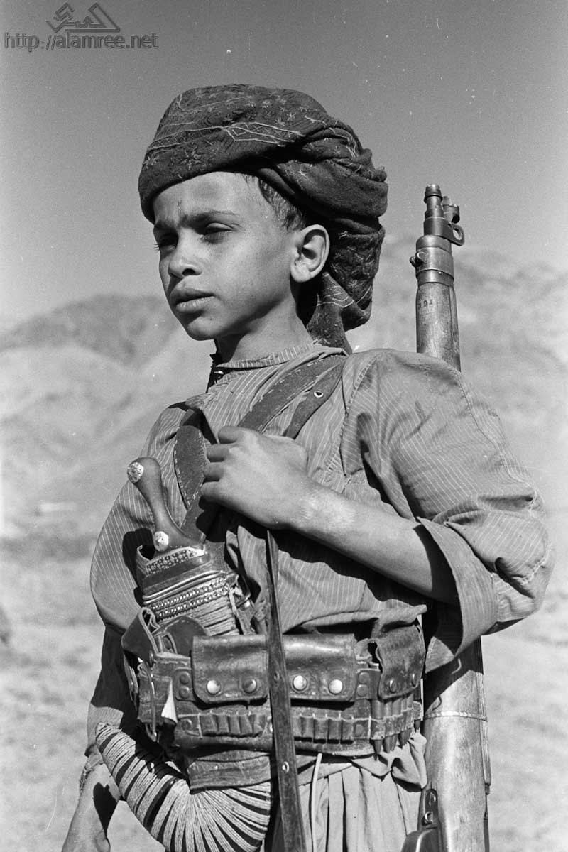 صورة لصبي صغير بخنجر مغمد في حزامه وممسكا ببندقية
