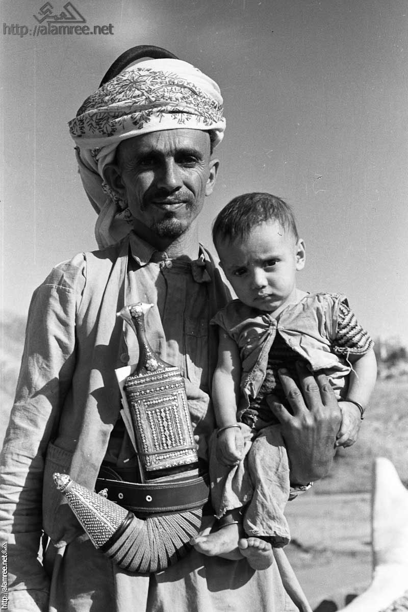 صورة للشيخ صلاح بن حسين بخنجر مغمد في حزامه ويحمل رضيع
