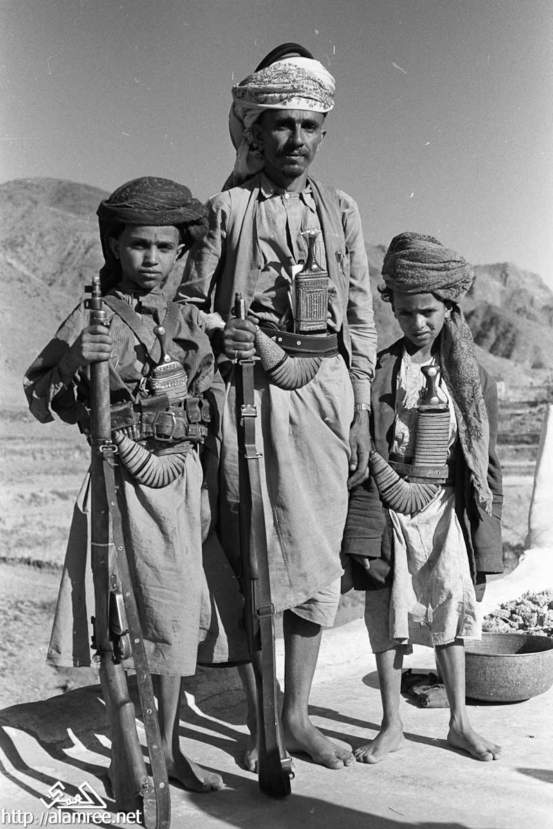صورة للشيخ صلاح بن حسين يحيط بها اثنين من الصبية. الجميع يحمل خناجر مغمده في أحزمتهم والولد الأكبر سنا يحمل بندقيه كبيرة.