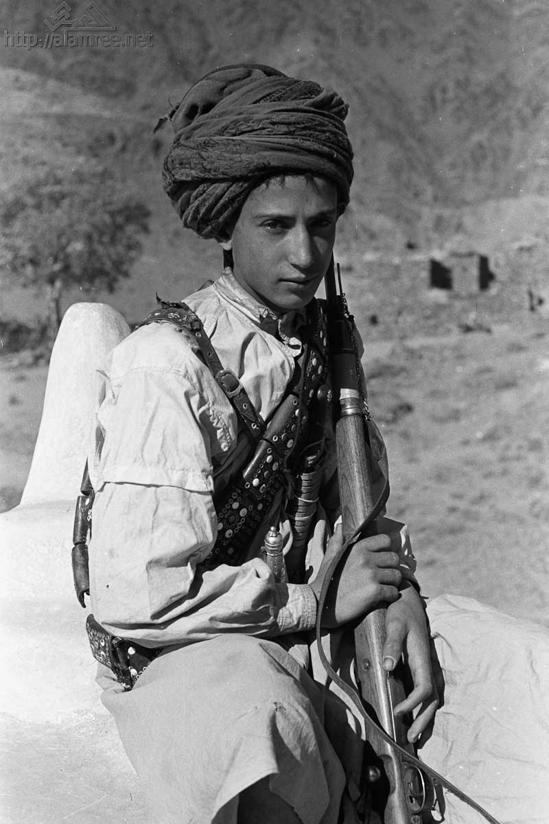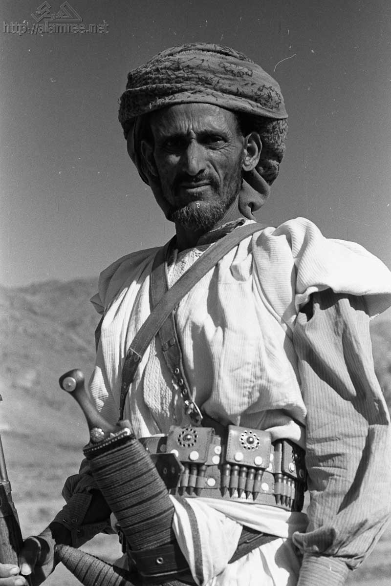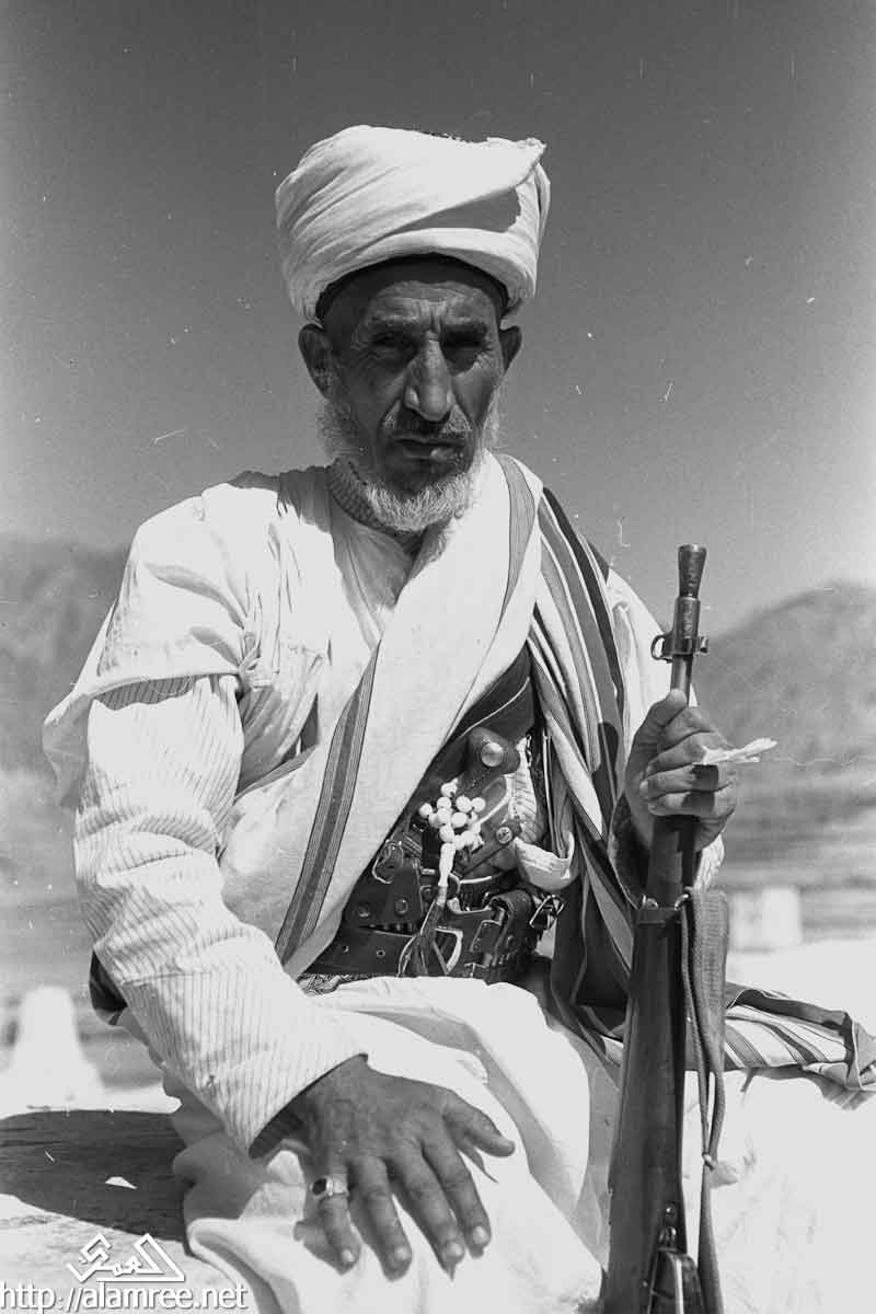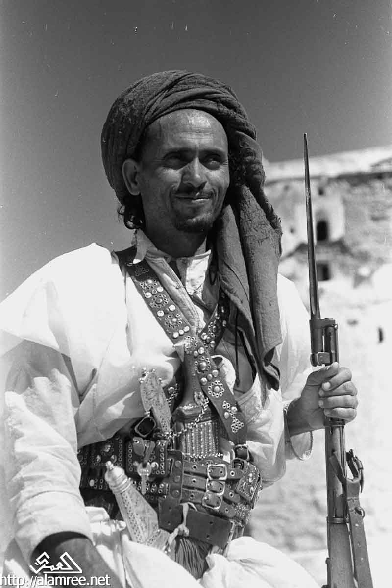صورة لرجل بخنجر مغمد في حزامه وممسكا ببندقية في يده اليسرى.