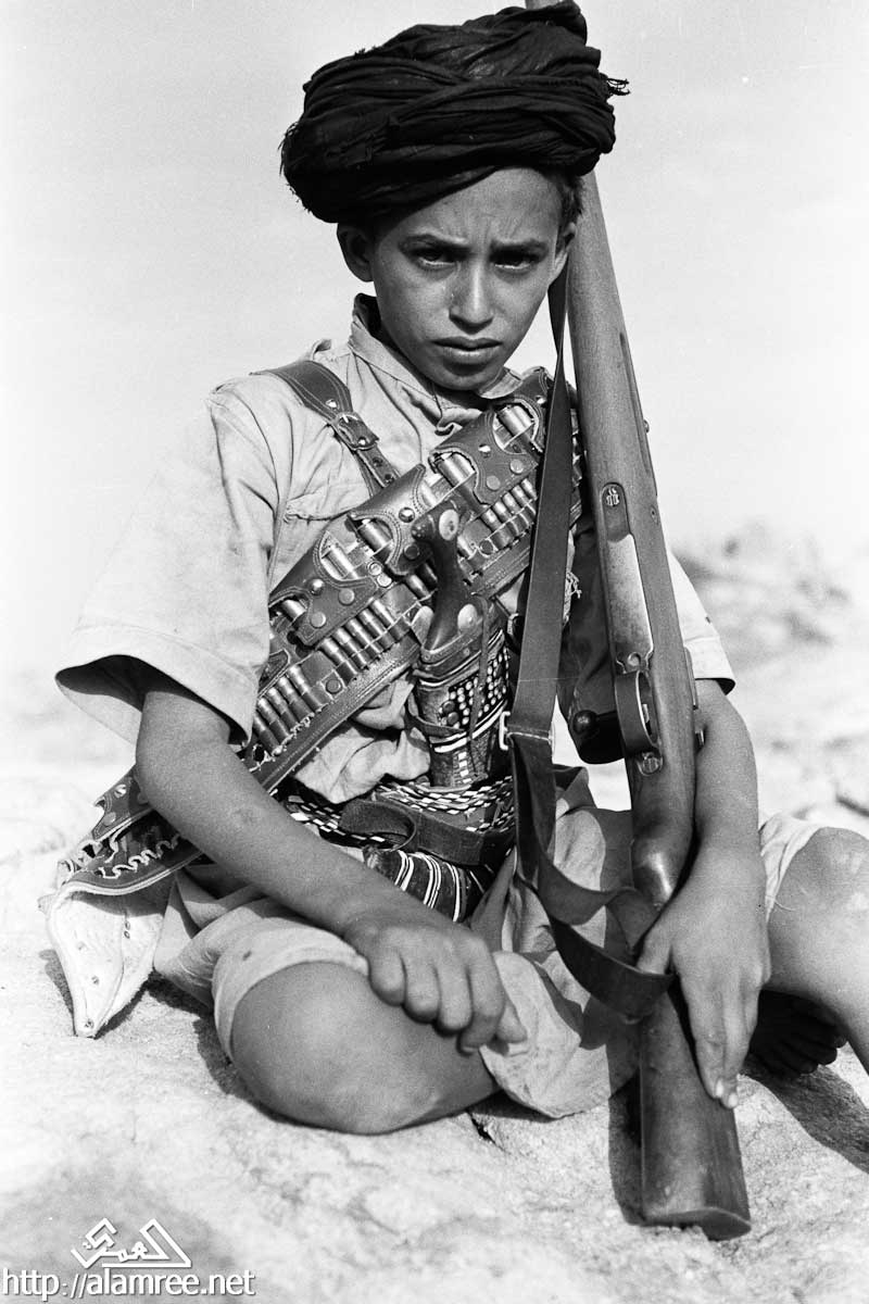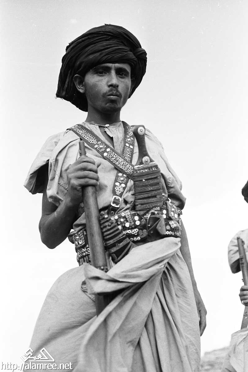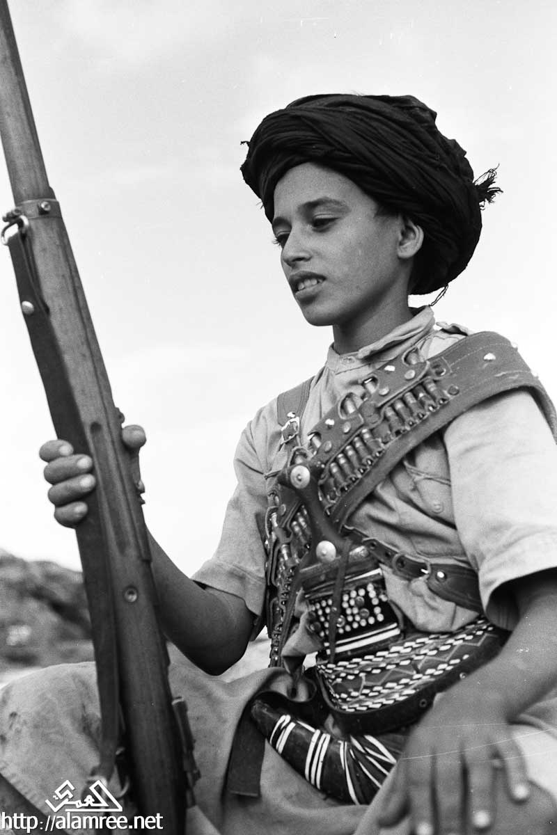 صورة لشاب يحمل بندقية كبيرة ويرتدي الماندولير حول صدره وخنجرا في حزامه