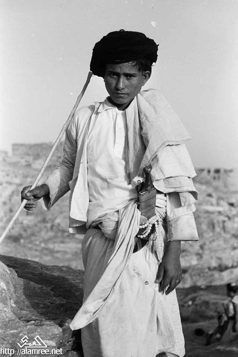 صورة لصبي ممسكا بعصا وخنجرا في حزامه