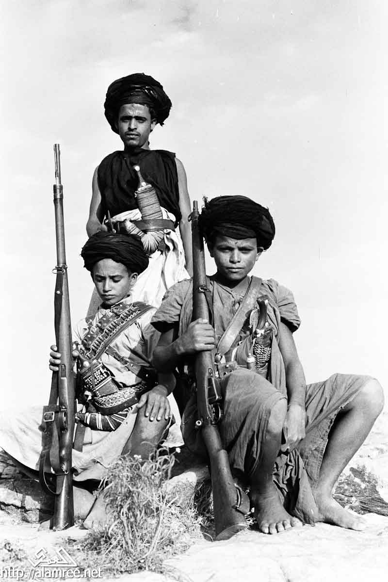 صورة لشاب وفتى. لديهم بندقية كبيرة وارتداء حمالات حول صدورهم ويكون الخناجر في أحزمتهم