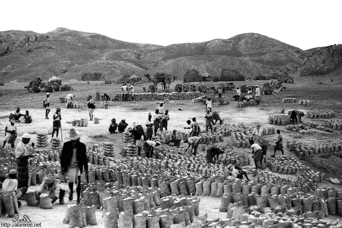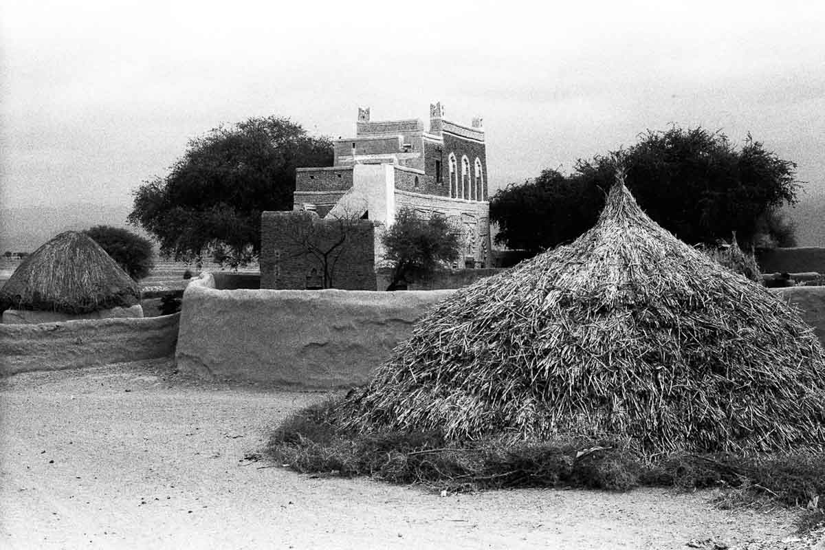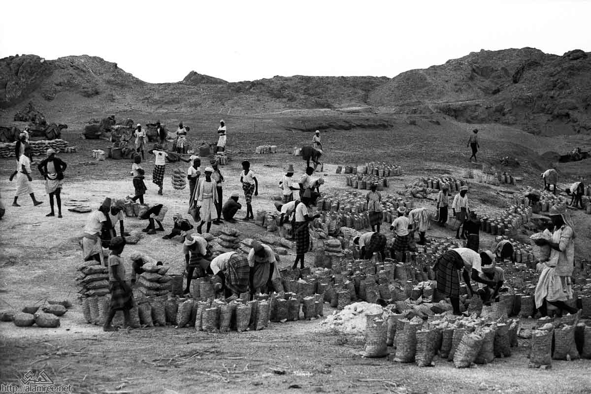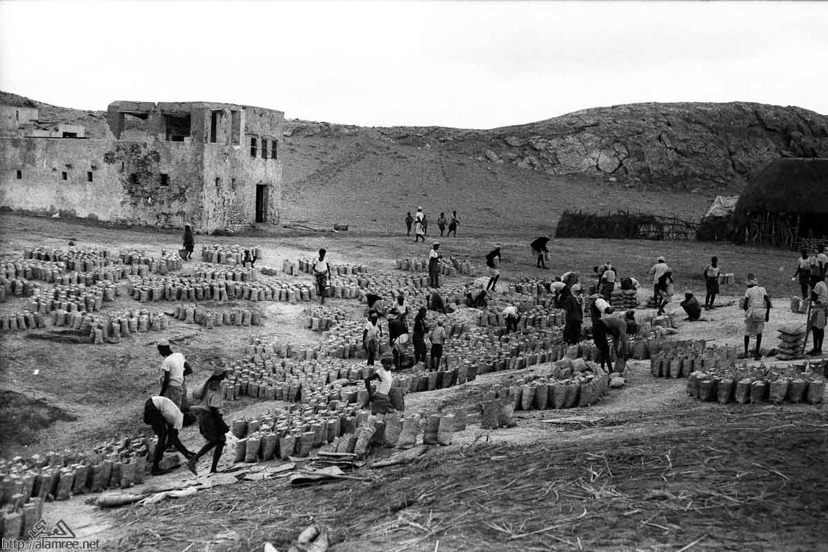 الحديده 1977م عرض لبعض المباني مع كومة كبيرة من القش (؟) في المقدمة.