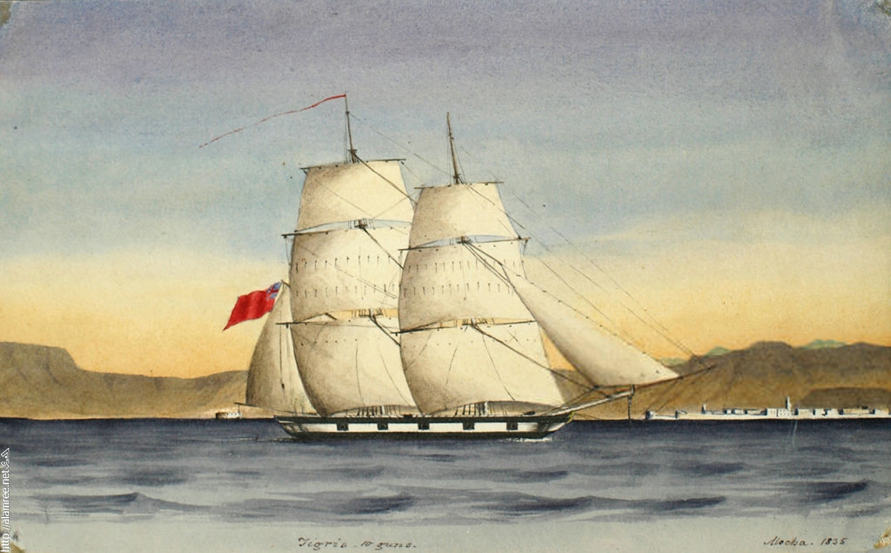 السفينة العثمانية دجلة 10 مدافع ، في ميناء المخاء ،1835م (تصوير روبرت كيرك / الجمعية الجغرافية الملكية |