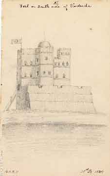 رسمه لقلعة على مرتفع في ميناء اللحية عام