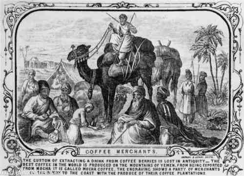 قوافل البن القادمة من الجبال تستريح قبل الوصول إلى مدينة المخاء نشرة تعود-إلى-العام-1850-ارشيف-هولتون |