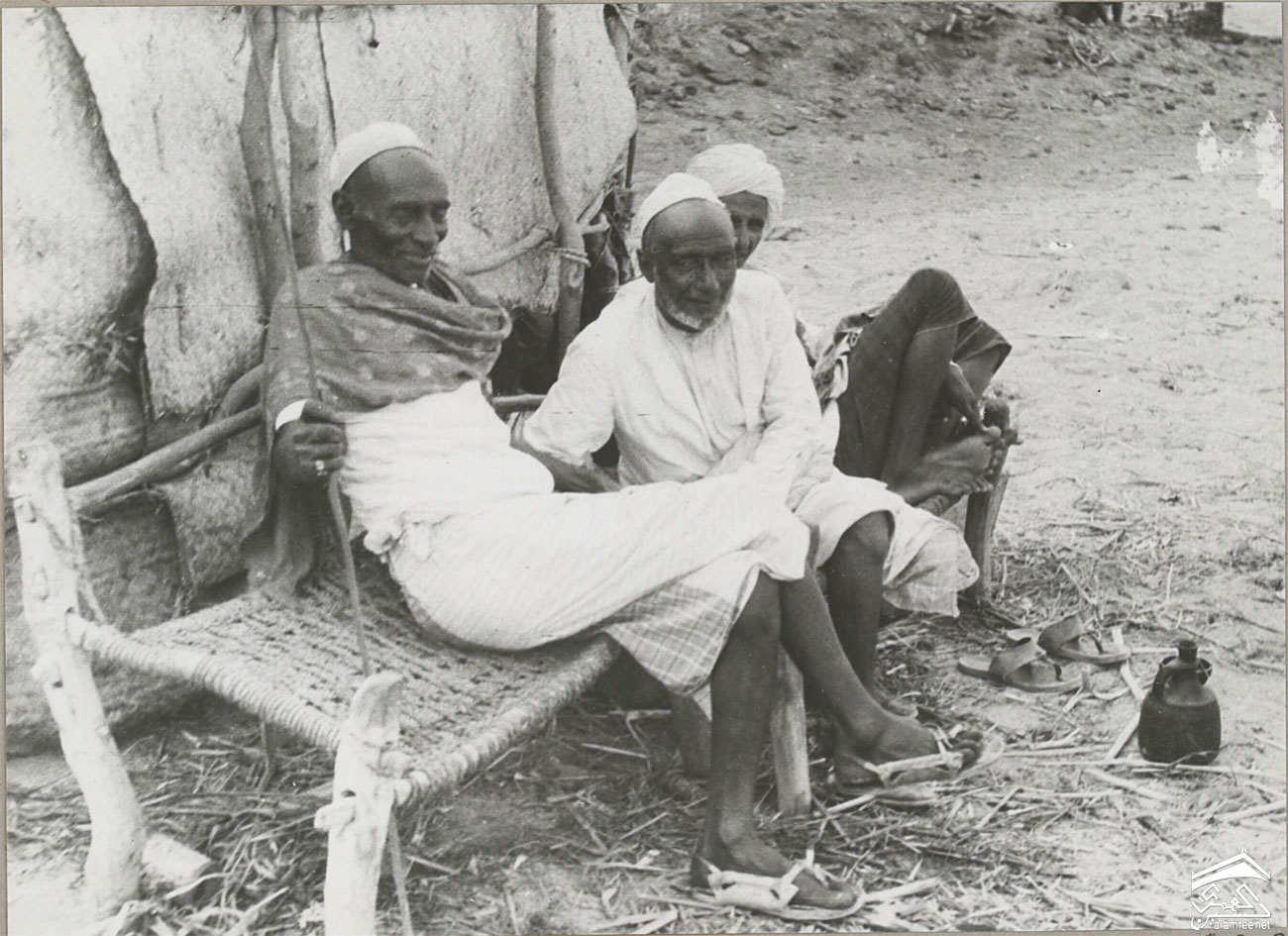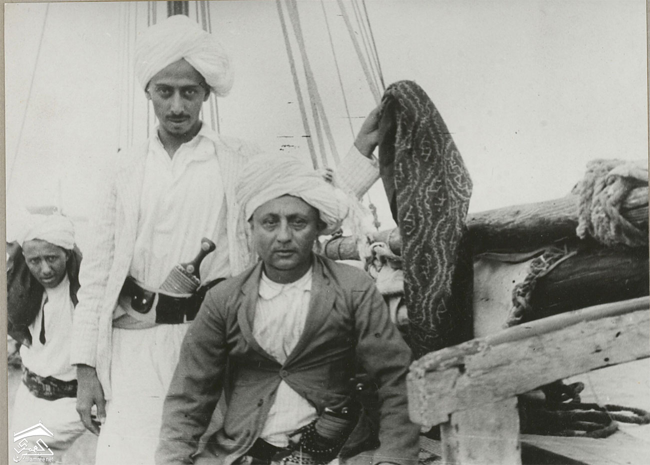 مسؤولون يمنيون جنوبيون على متن السفينة "المطيرية". لاحظ العمائم ذات الطراز الهندي والخنجر المحاط بالمسبحة. عمر بحر على متن المسترية
