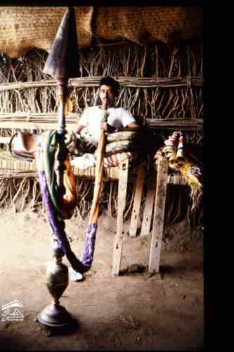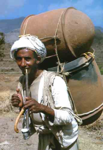 ![]() رجل يمني يدخن غليونه الفخاري ويحمل الماء في أباريق من الطين في المخا، اليمن 1964. تصوير توماس أبركرومبي |