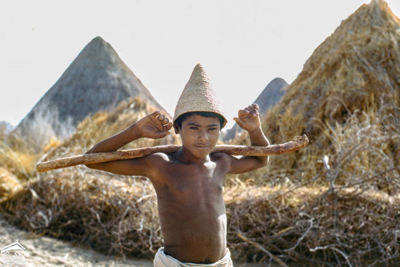 ![]() صبي راعي يمني في قرية الشبة والمعروفة أيضًا باسم الشعبة الواقعة على سهل تهامة الصحراوي الساحلي على البحر الأحمر حيث توجد أكواخ من الطين المجفف ذات أسقف مخروطية من القش، اليمن 1964. تصوير توماس أبركرومبي |