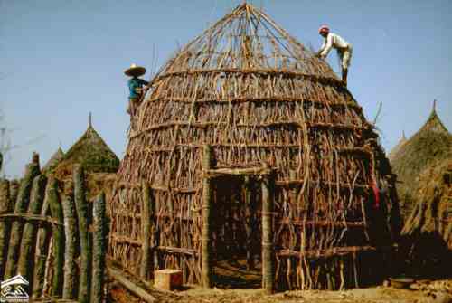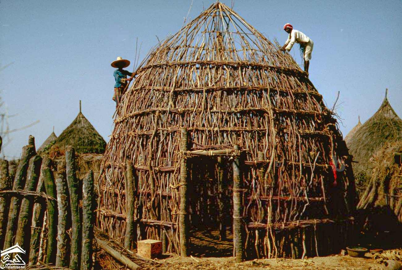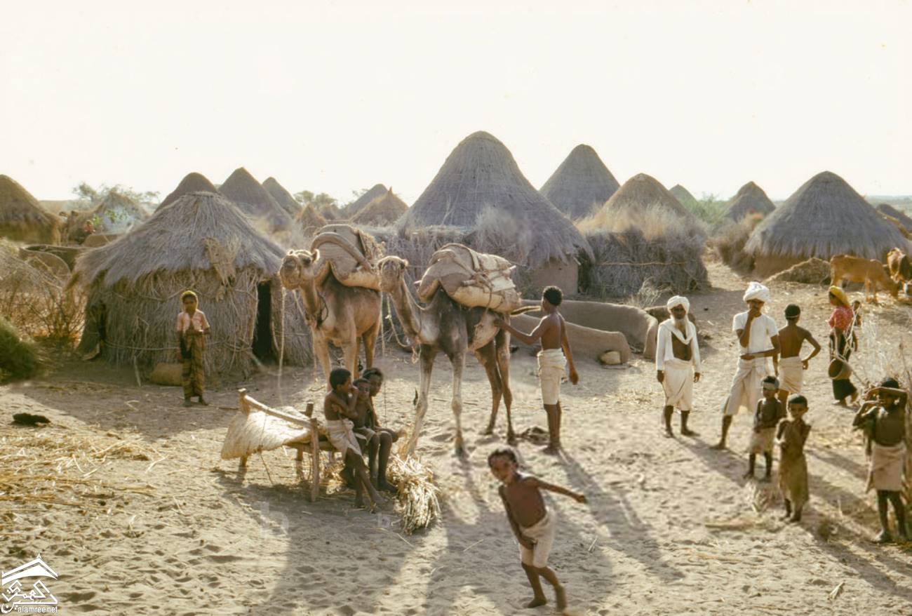 ![]() أسقف مخروطية من القش تميز قرية الشبة والمعروفة أيضًا باسم الشعبة الواقعة على سهل تهامة الصحراوي الساحلي على البحر الأحمر، مع أكواخ من الطين المجفف والقش، مع جمال للقافلة والقرويين، اليمن 1964. تصوير توماس أبركرومبي |