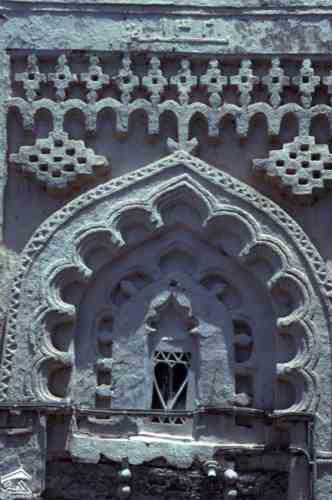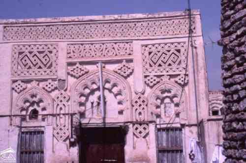 واجهة بيت مزخرف بزخارف جصية في مدينة زبيد ثمانينيات القرن الماضي |