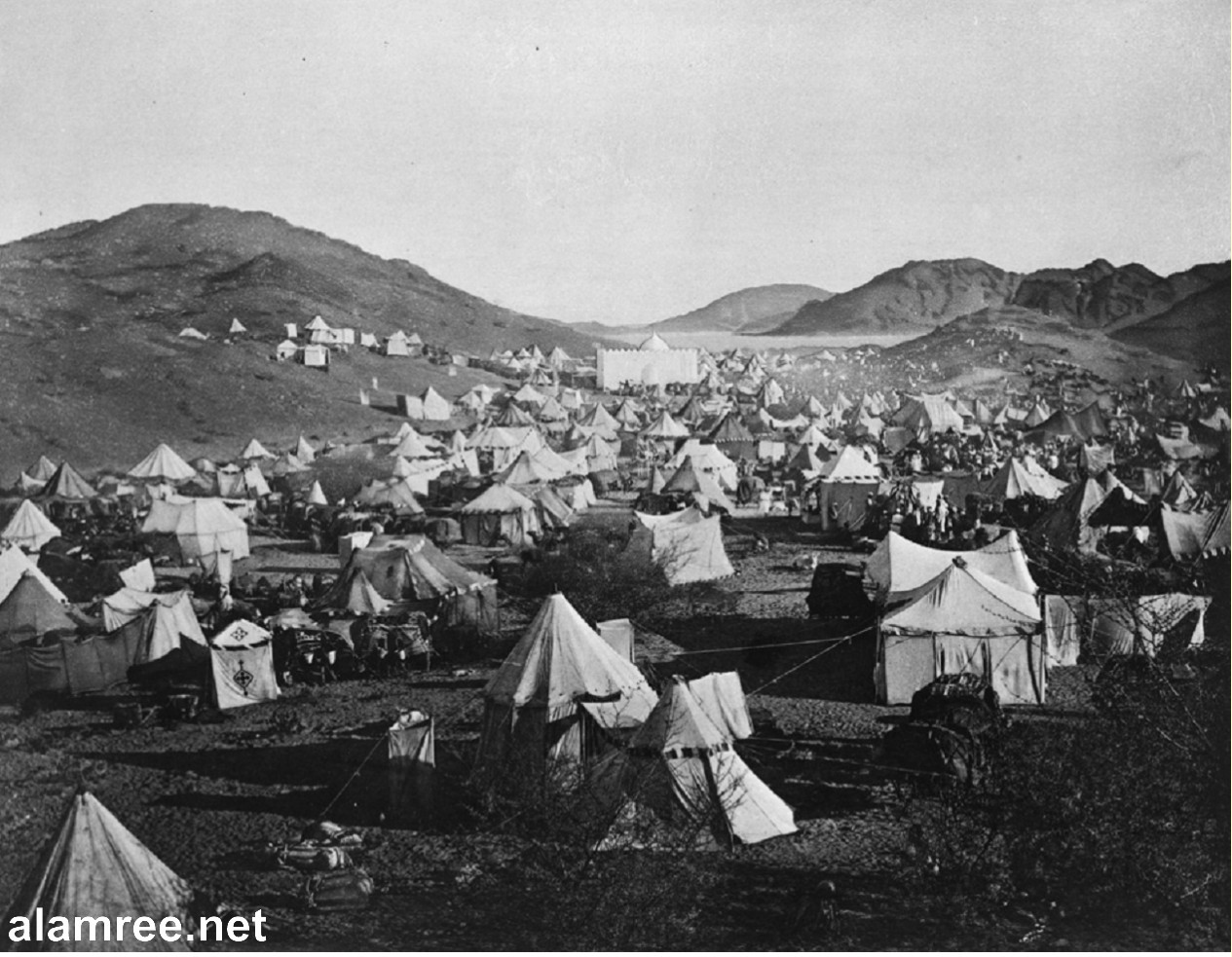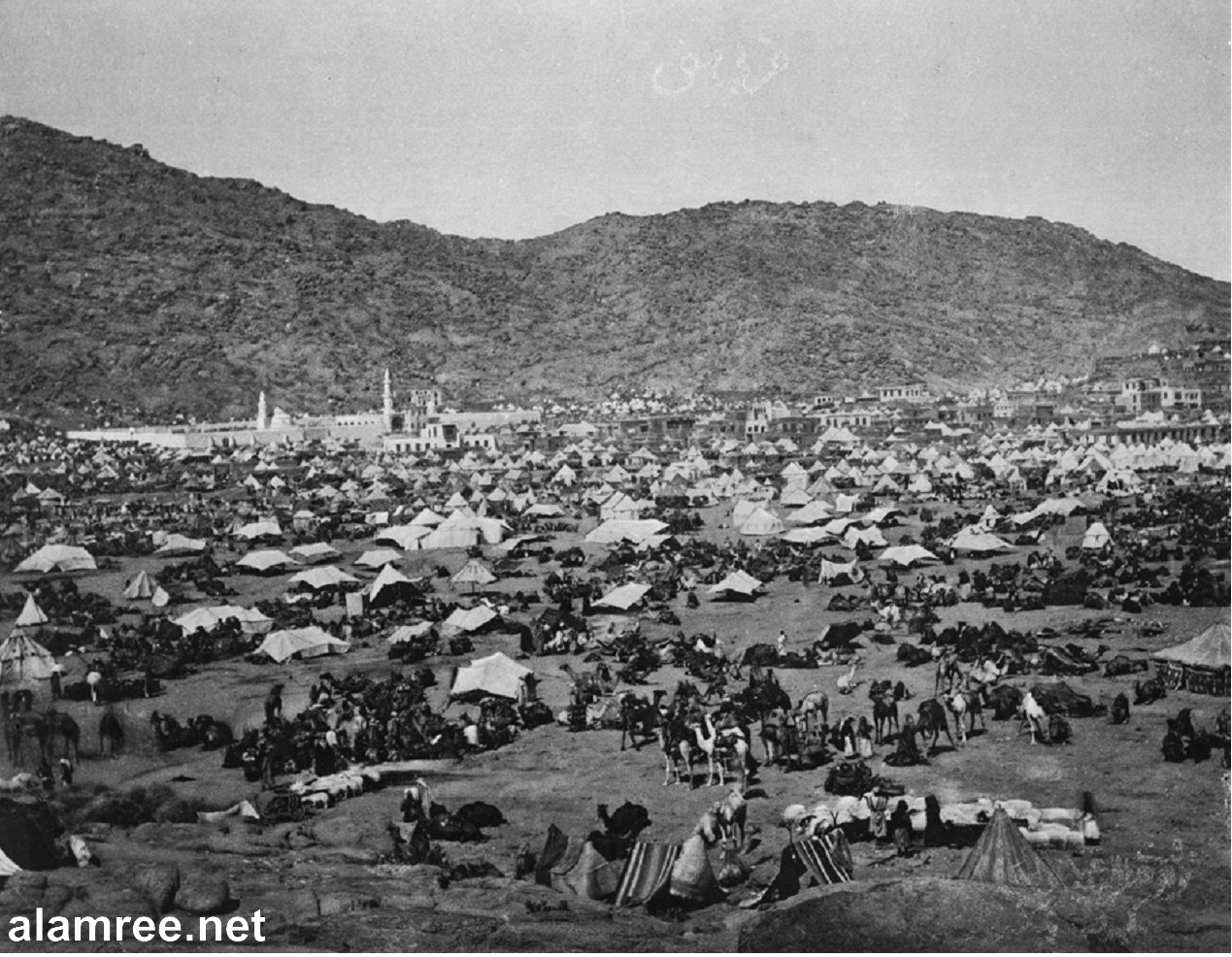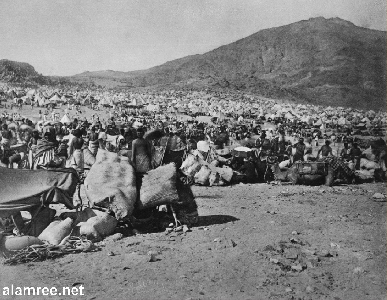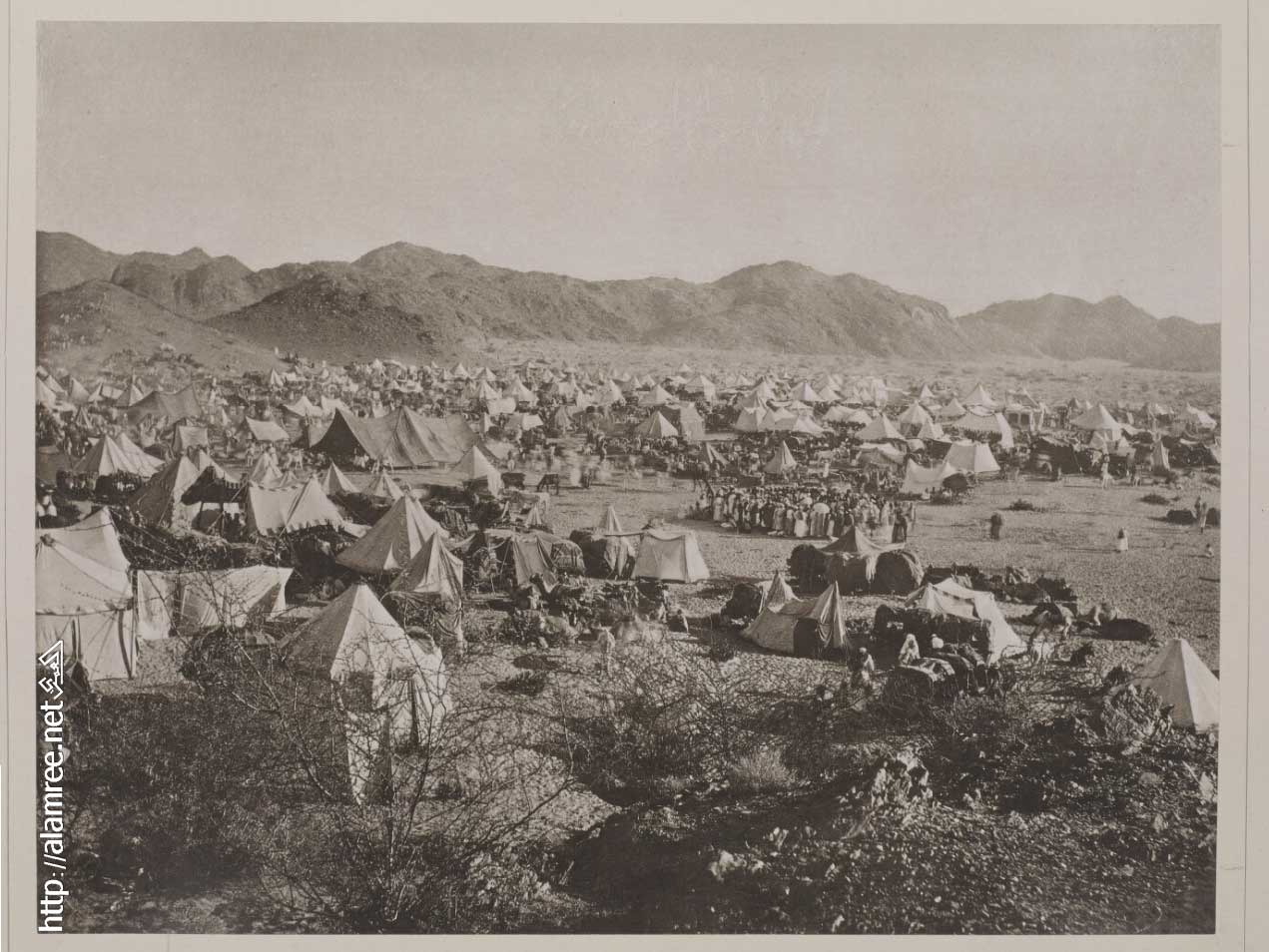 جبل عرفات خلال التجمع السنوي الكبير للحجيج (المشهد من الجنوب)." تصوير: السيد عبد الغفّار عام 1888م