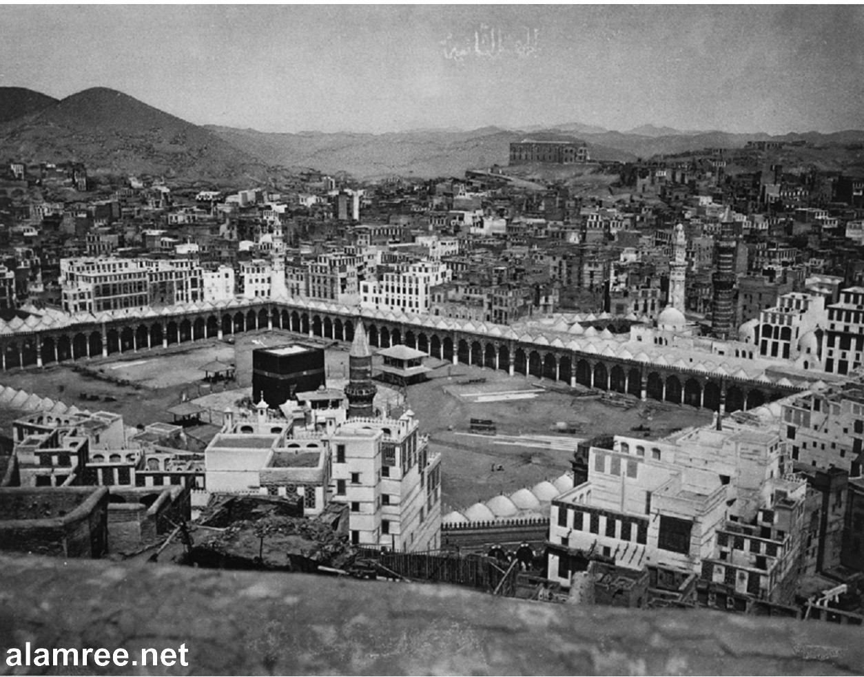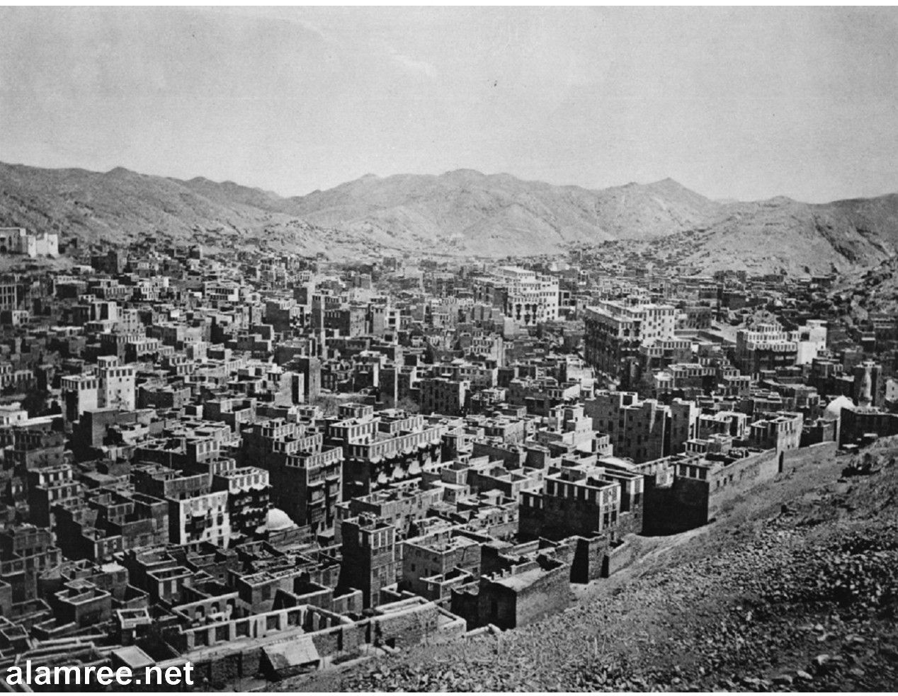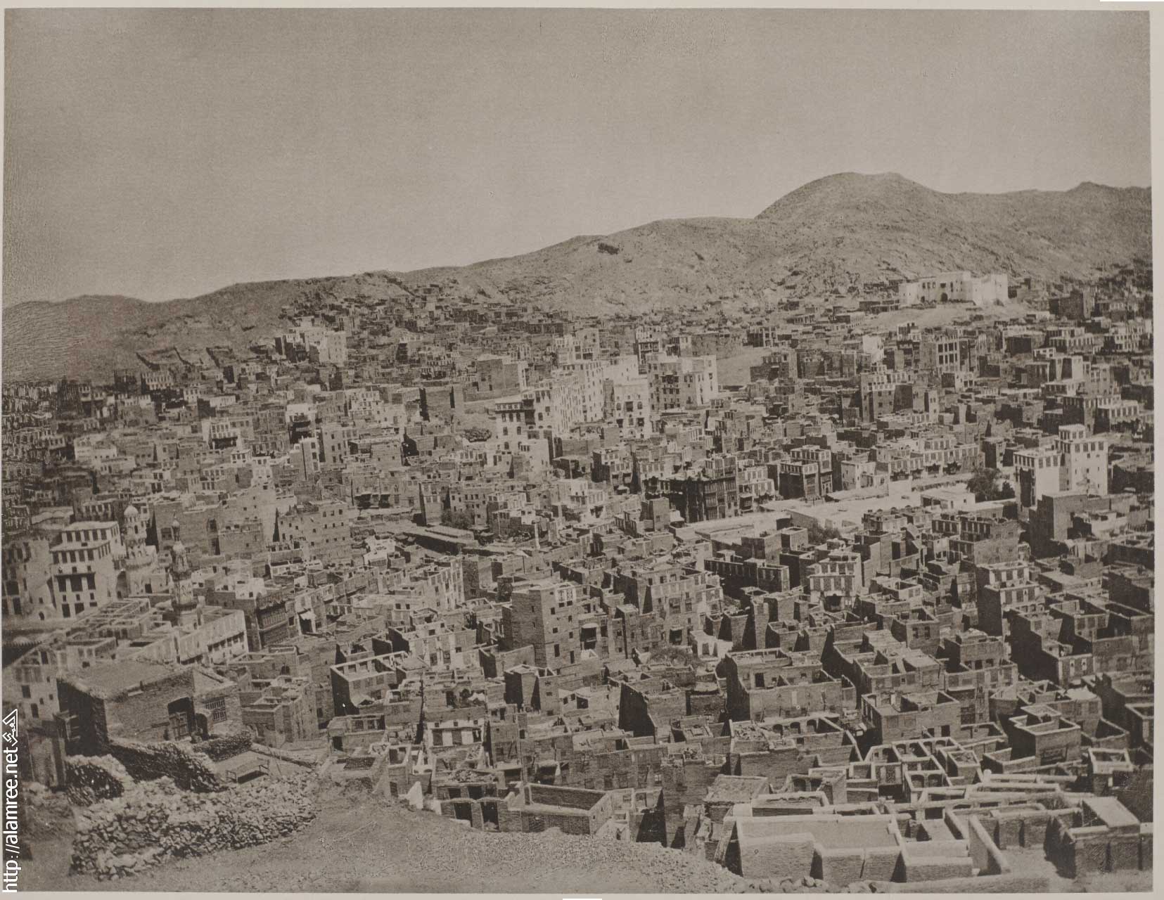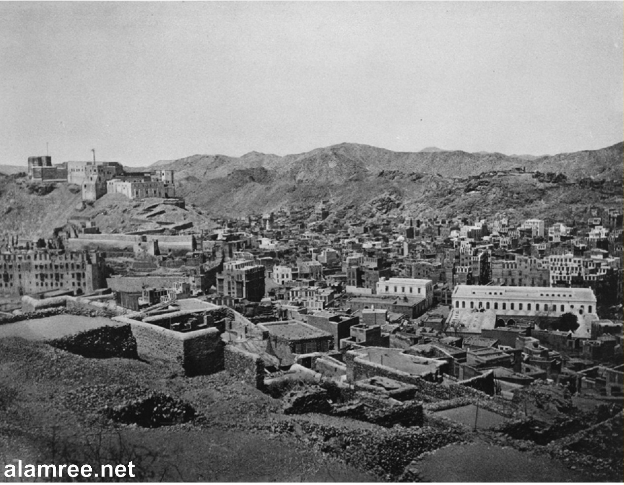 المشهد الأول لمدينة مكة: يسارًا في الخلفية قلعة أجياد. المبنى الكبير ناحية اليمين هو الحامدية، والمطبعة على يساره.تظهر