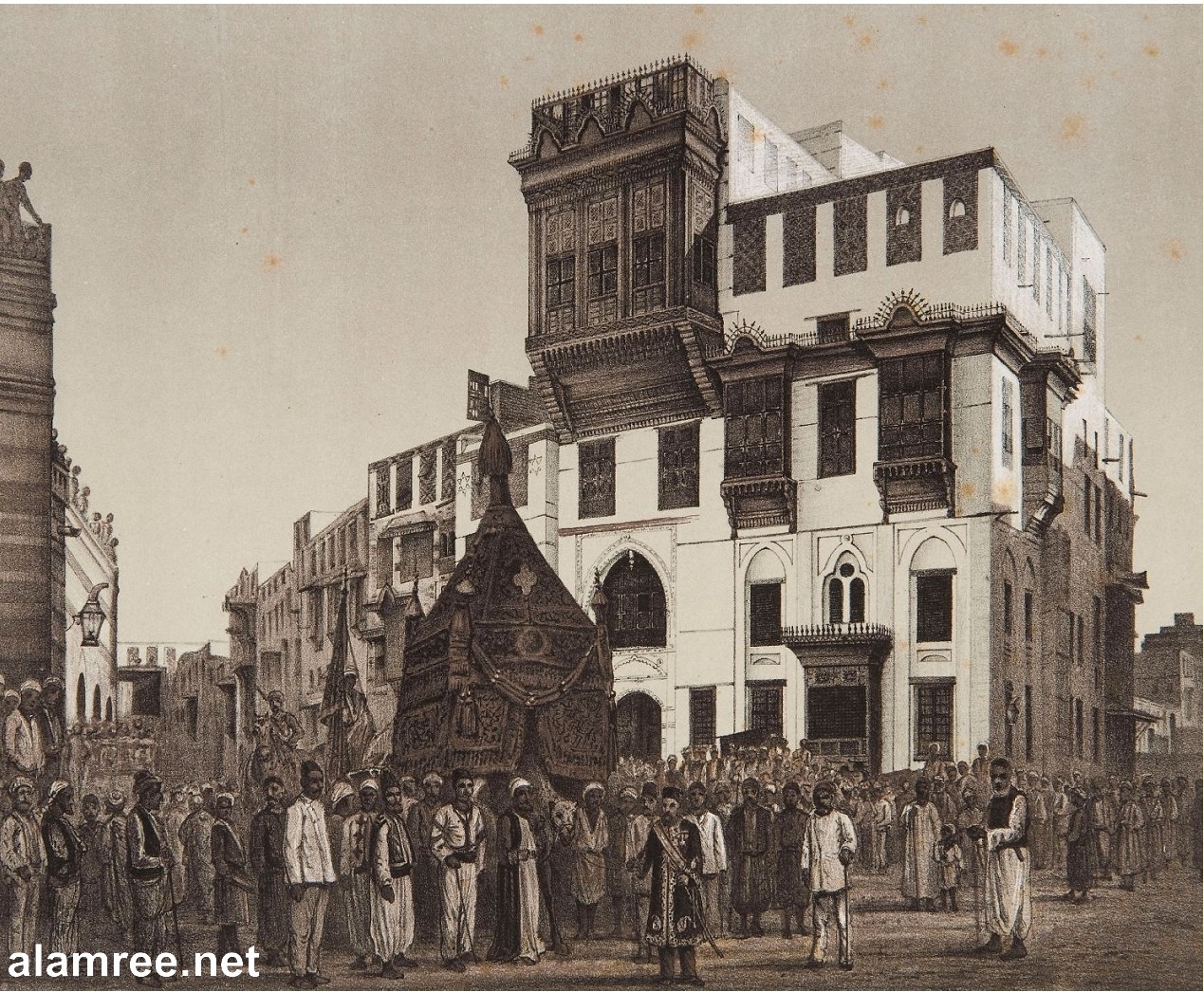 منظر من الشارع يعرض وصول "المحمل" المصري إلى مكة - هودج مزركش مغطى بالحرير مركب على جمل - تتبعه قافلة من الحجيج. يبدو هذا المحمل فارغًا، إلا أنه مصمم في الأصل لحمل كسوة الكعبة المصنوعة بمصر.