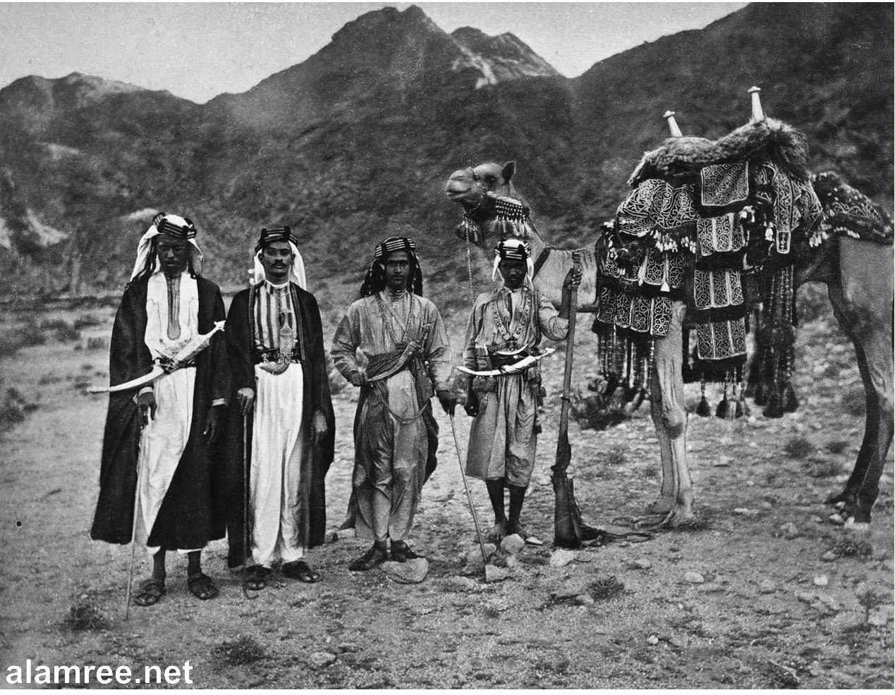 إبل الركوب (الهجين) للشريف يحيى، ابن الشريف أحمد، الذي كان أبوه الشريف الكبير عبد المطلب الذي توفي في ١٨٨٦ (قارن بشأن آخر ملوك مكة من العهد القديم، 'مكة'، مجلد I، صص.١٦، صص.١٧٤)، مع قماش للسرج غني بتطريز الفضة. يمسك باللجام عبد مملوك ليحيى؛ ويقف يحيى بجانبه برداء الركوب ويسارًا يقف شريفان بدرجة أقل مرتديان ملابس طويلة." تصوير: السيد عبد الغفّار.