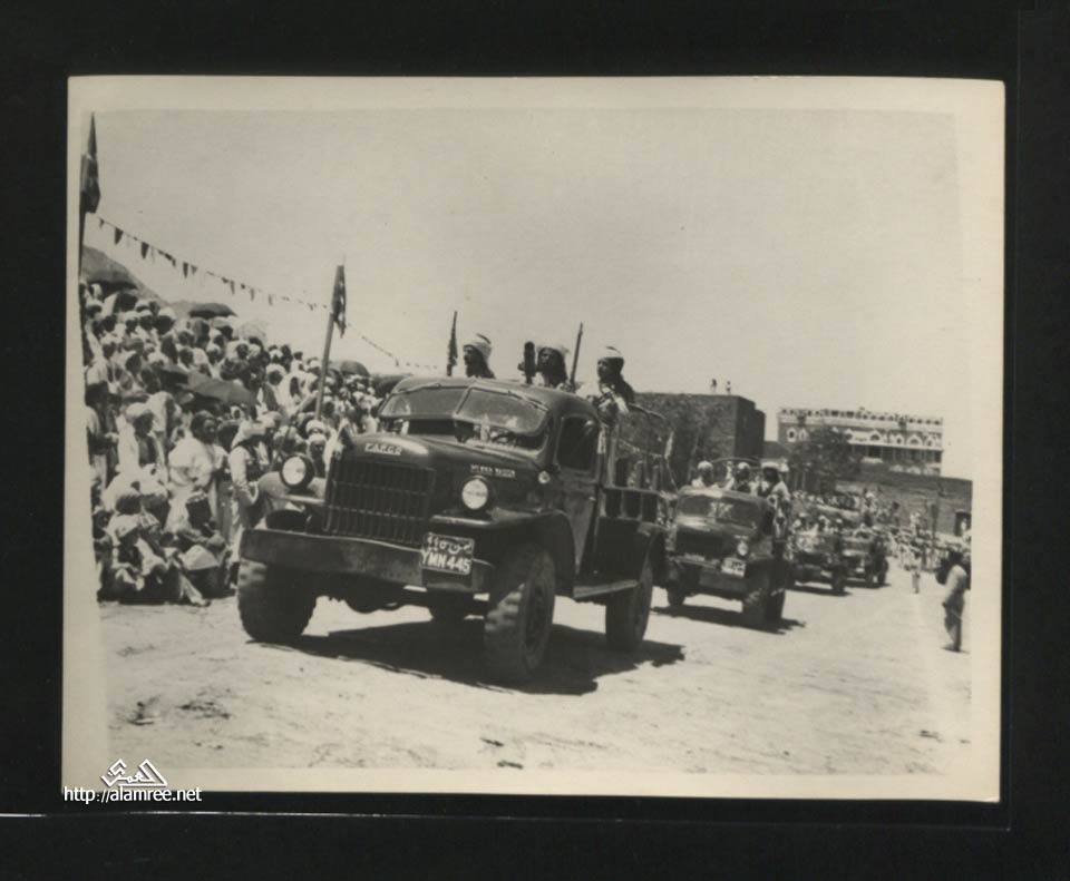 مرور عربات الجيش في العرض العسكري في تعز عام 1952 |