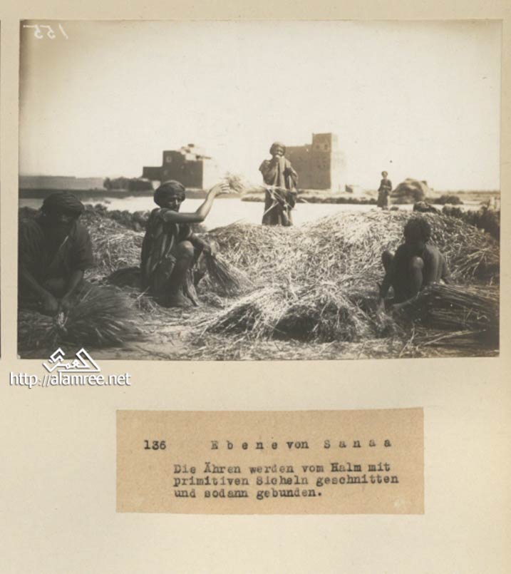 ![]() جانب من صنعاء : السنابل تقطع من أغصانها بمناجل بدائية ومن ثم تربط. |