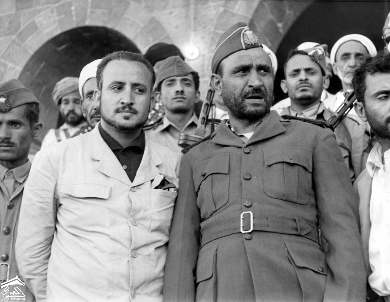 الرئيس اليمني عبدالله السلال وبجابنة نائبة الدكتور عبدالرحمن البيضاني وعدد من ثوار ستمبر الصورة في 7 اكتوبر 1963م |