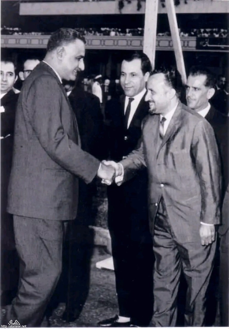 ![]() عبدالرحمن البيضاني يمصافحا الرئيس جمال عبدالناصر |