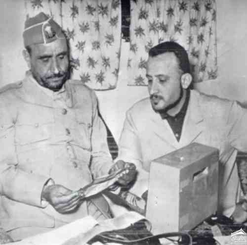 ![]() اعبدالرحمن البيضاني وحسن العمري امام اول طبعة ورقية للريال اليمني عام 1963م |