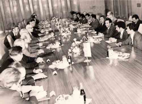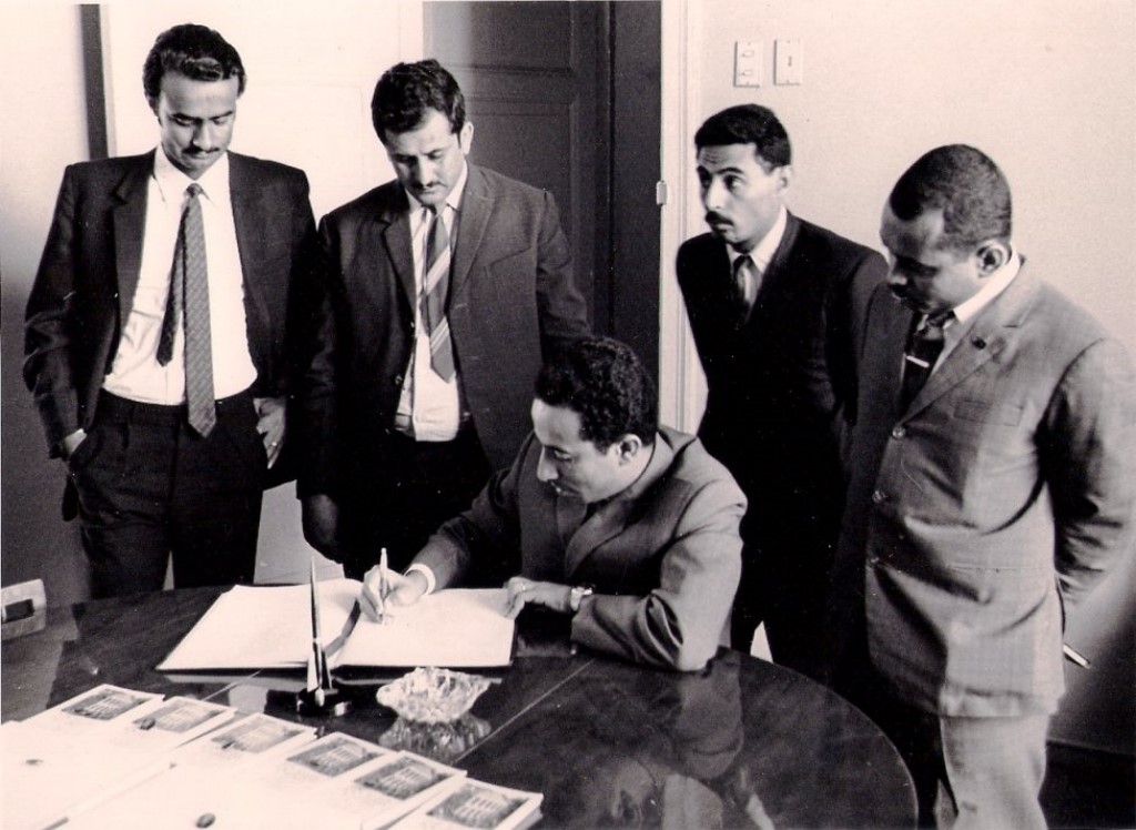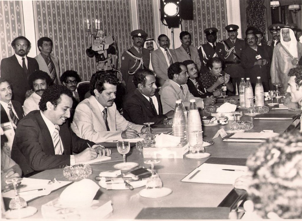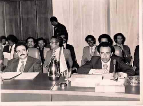 يظهر هنا وفد اليمن الديمقراطي برئاسة محمد صالح مطيع (يمين) وزير الخارجية.