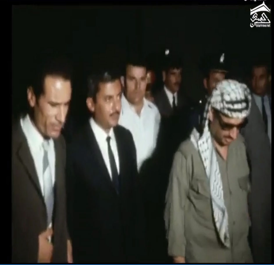 الرئيس سالم ربيع علي ومعمر القذافي وسط والقاضي عبدالرحمن الارياني رئيس المجلس الجمهوري في الجمهورية العربية اليمنية في طرابلس الغرب عام 1972م