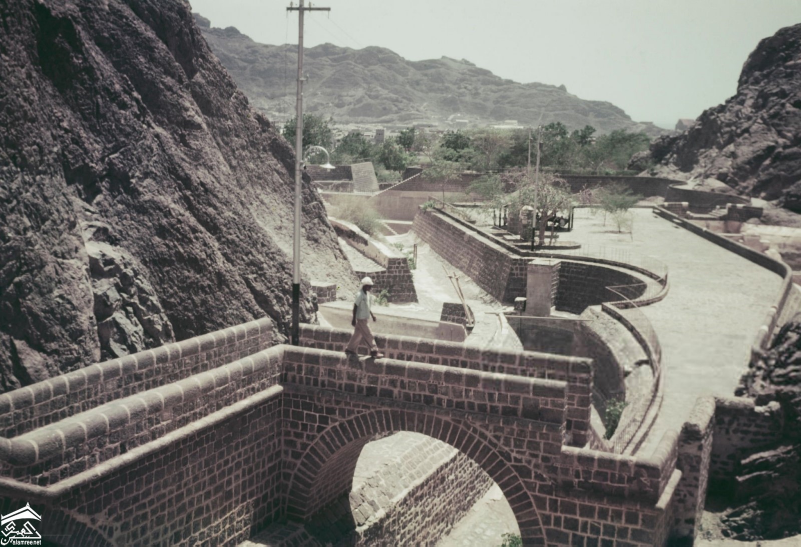 رجل يسير عبر جسر مقنطر فوق صهاريج طويلة ، وهي سلسلة من الخزانات والخزانات لجمع المياه وتخزينها ، في وادي طويلة