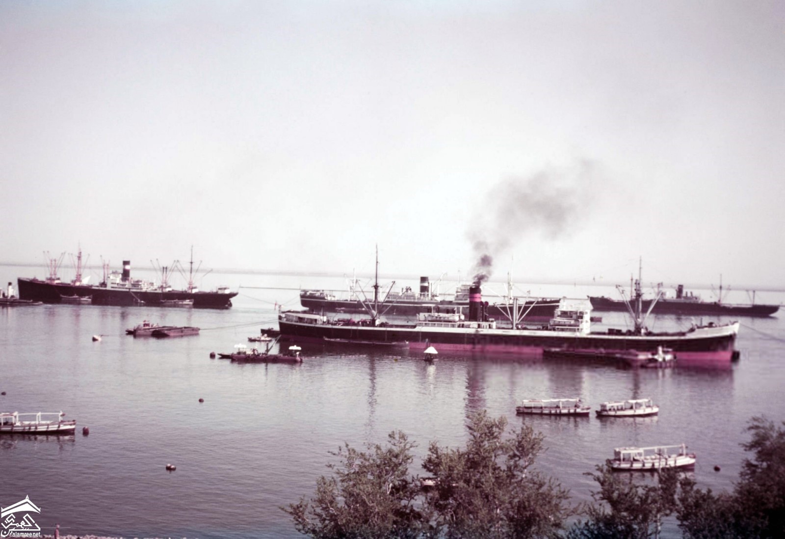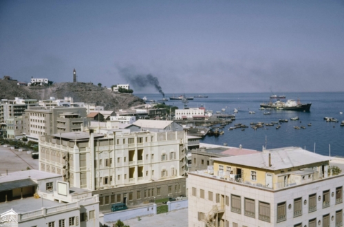 صوره من برج ساعة بيغ بن ، القوارب والسفن الراسية بالقرب من الأرصفة البحرية في ميناء عدن عام ١٩٦٤م تصوير بول بوبر