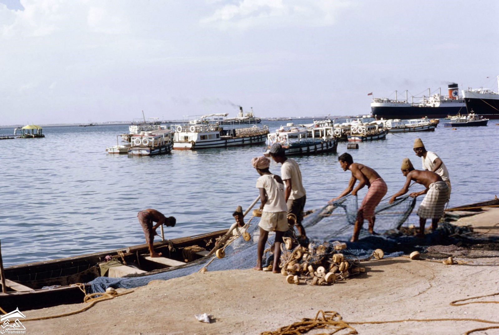 الكبسه البنجسار "نشوان حاليا" صيادون يسحبون شباكهم من مياه المرفا في منطقة التواهي في ابريل ١٩٦٣م ، تصوير بول بوبر |