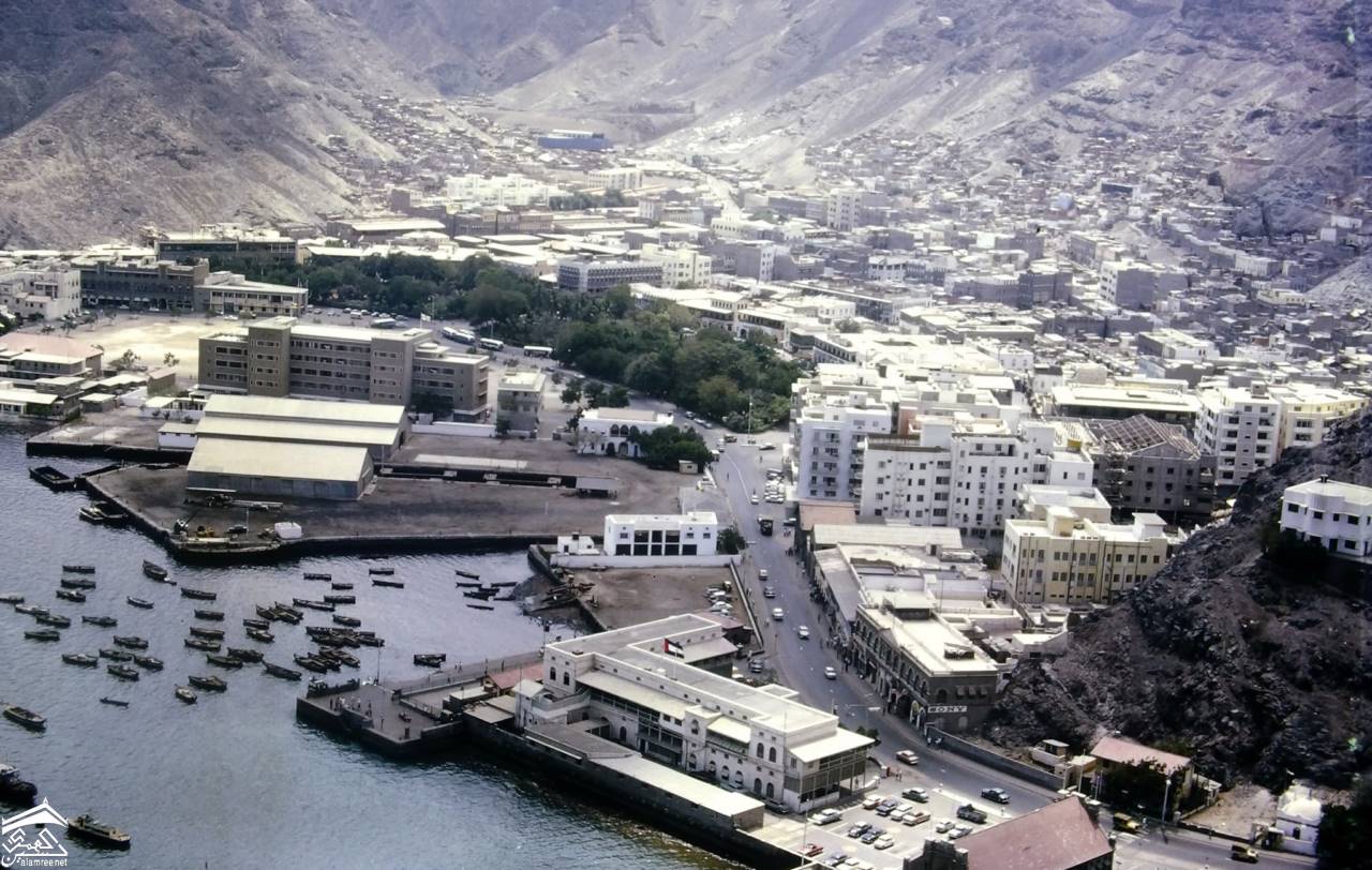 صورة جويه لميناء المعلا وفي الخلفية جبل شمسان يحتضن الشارع