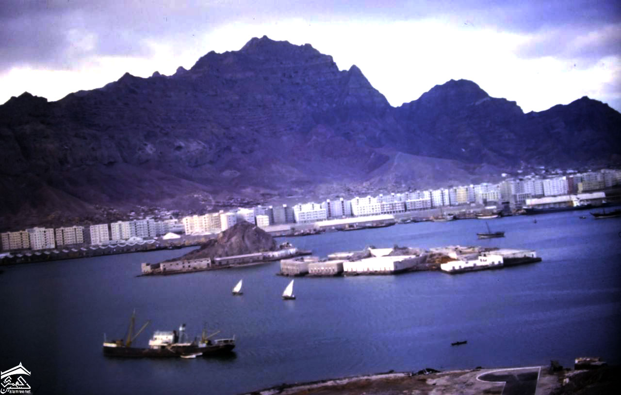 صورة جوية لميناء عدن التواهي للمصور سيدني جيمس جونسون حيث خدم في سلاح الجو الملكي البريطاني من عام 1947 إلى عام 1969. وفي عام 1963 تم تعيينه في سلاح الجو الملكي البريطاني في خورمكسر في عدن كمهندس وعضو في طاقم مروحيات بلفيدير ذات المحركين |