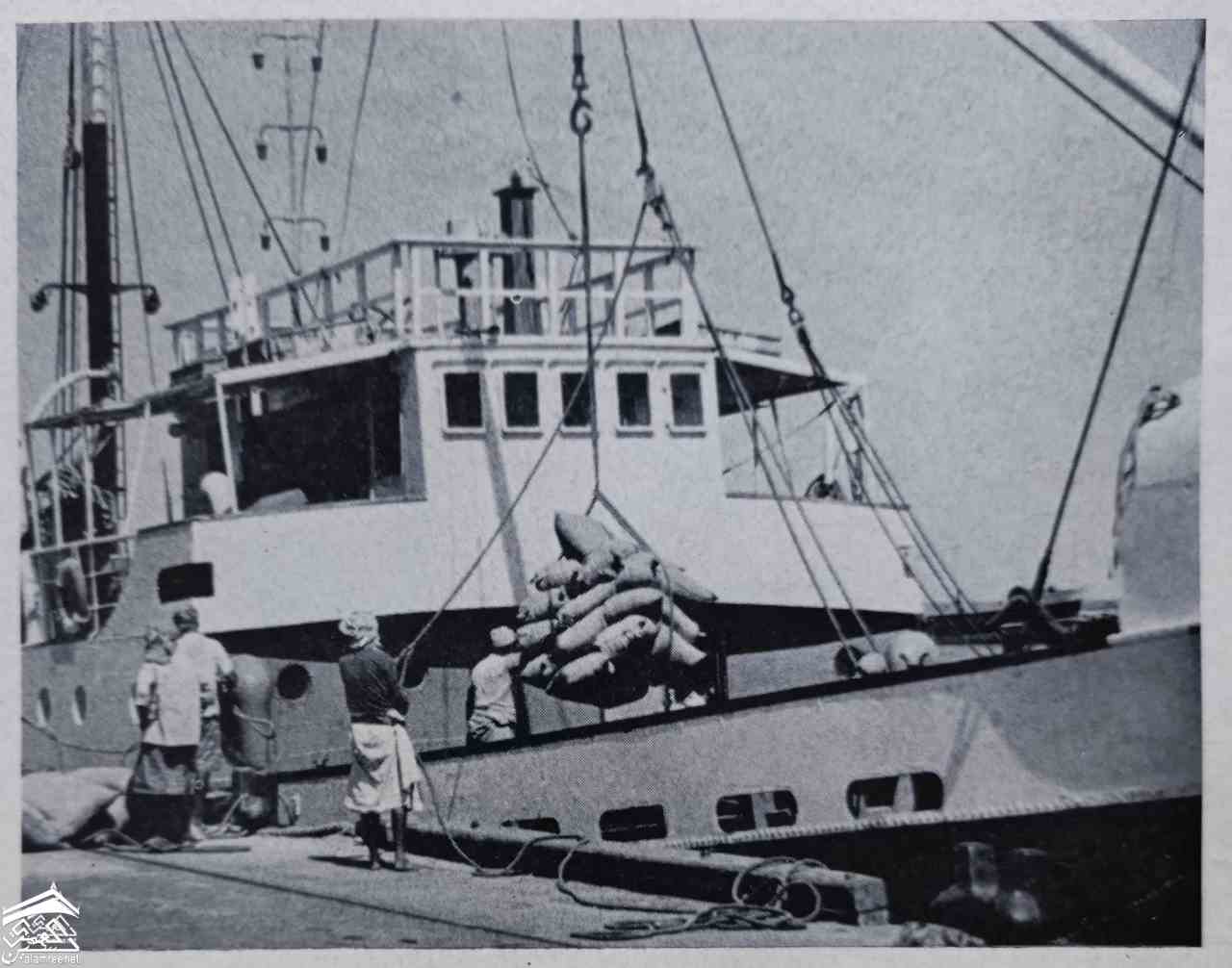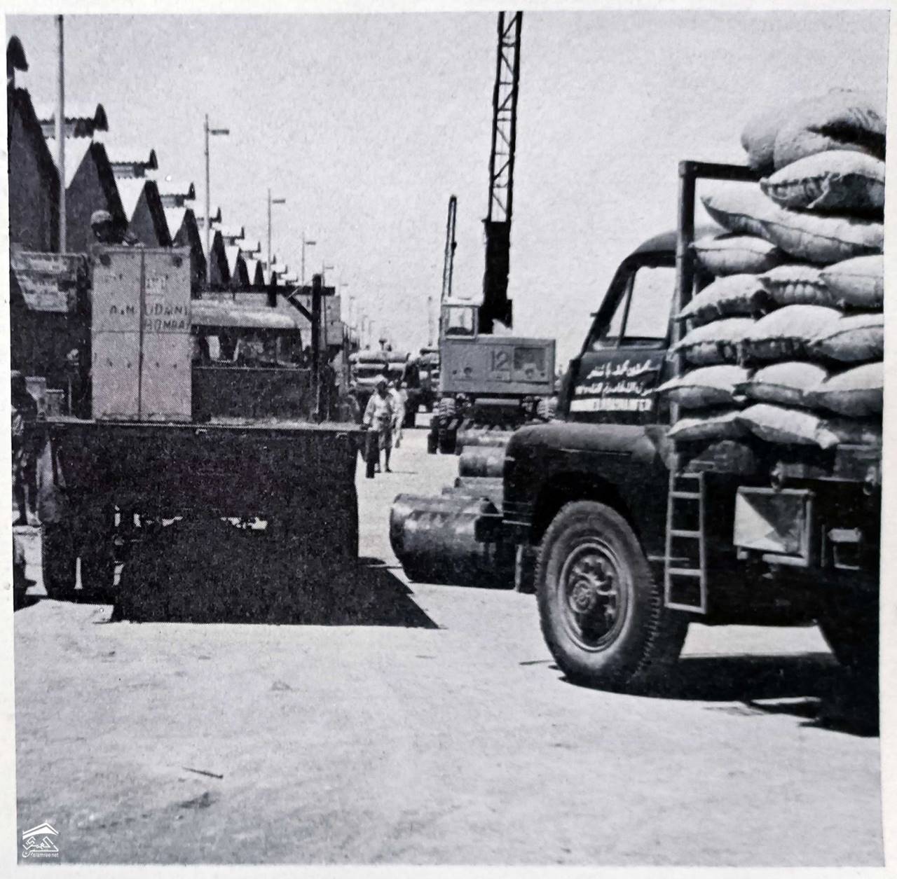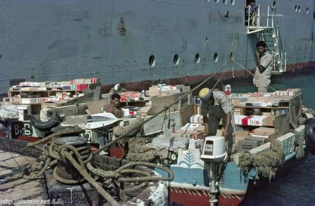 ميناء عدت عام 1958م واحد صنادل الشحن والتفريغ يكاد يكون مملوئا بالبضائع وفي انتظار احد